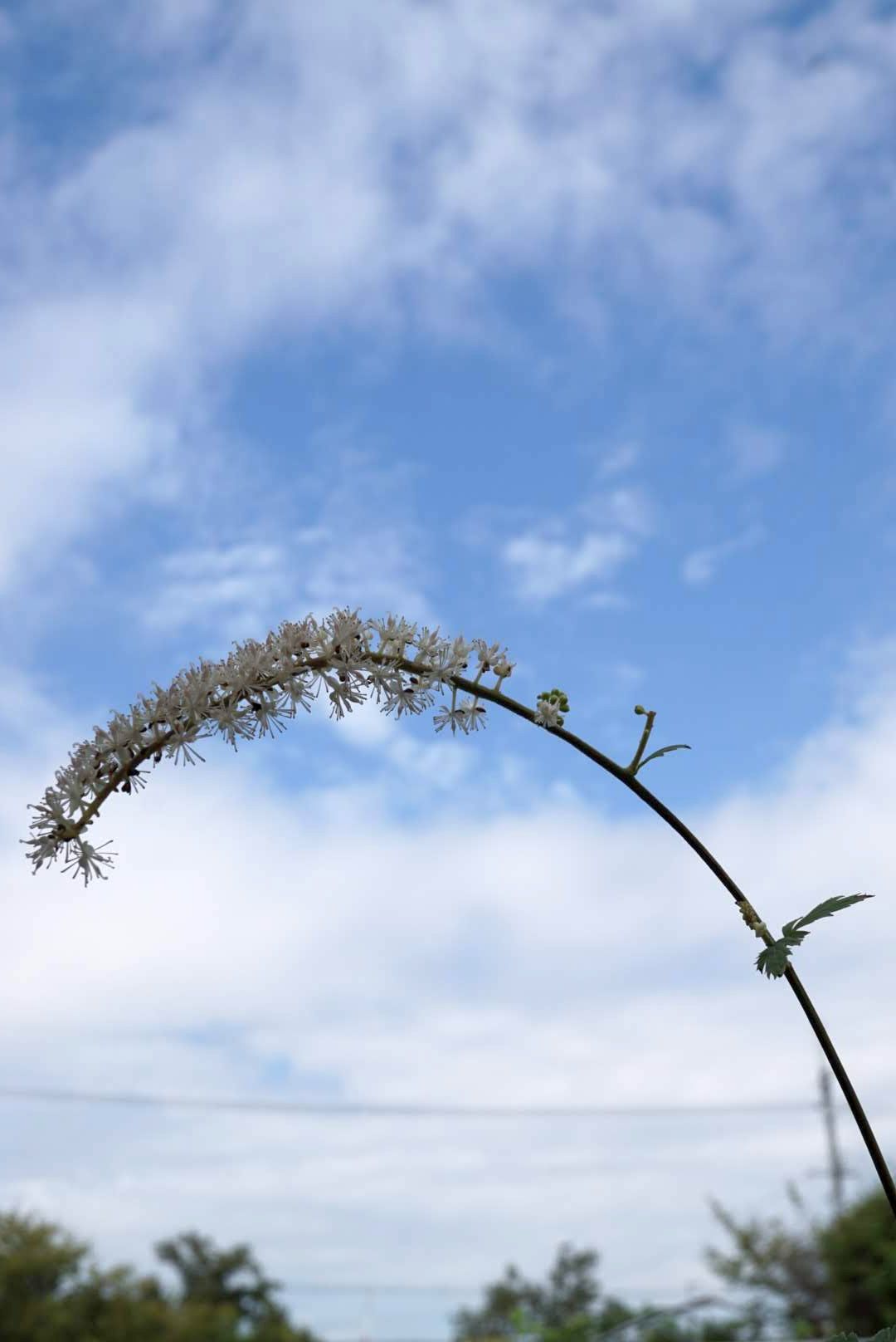 花期は秋、花は白色の5弁花で穂状花序につき、おしべが目立つ.