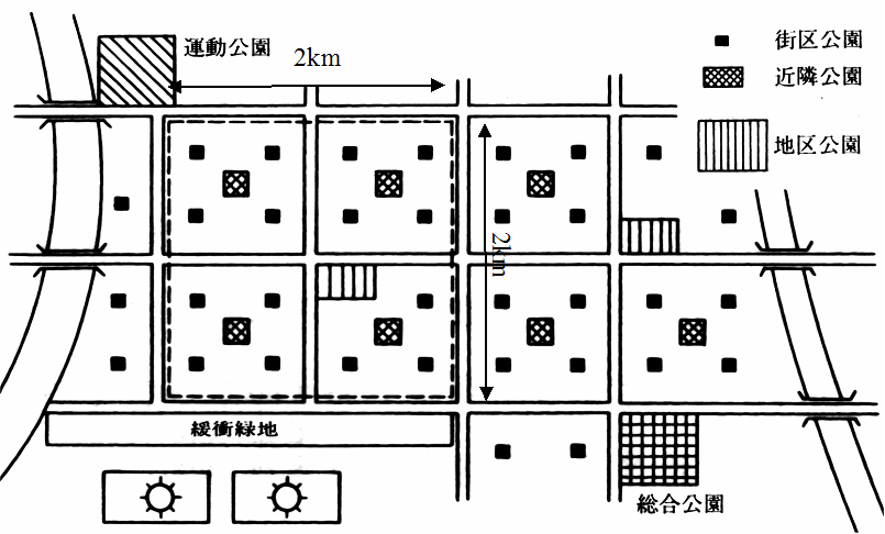 まず、都市計画の分野で提唱されている図-3の住区基幹公園の配置図に着目しました。住区基幹公園は2km四方に街区・近隣・地区公園の3種類の規模の公園を整備することを目標としています。そこで、この配置のパターンを図-4のように応用しました。 |