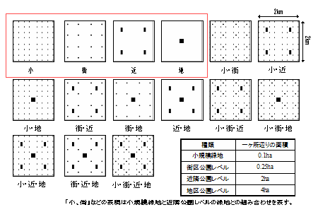 図-4が典型的な緑地分布状態を表す標準データ群です。最近の緑地政策は小規模緑地を整備する傾向があり、また住区基幹公園の整備目標を応用しているため大きめに面積をとっている可能性があることから、小規模緑地を導入しています。赤枠で囲まれたタイプを基に組み合わせ作成しています。これらを類型化の基準として用います。 |