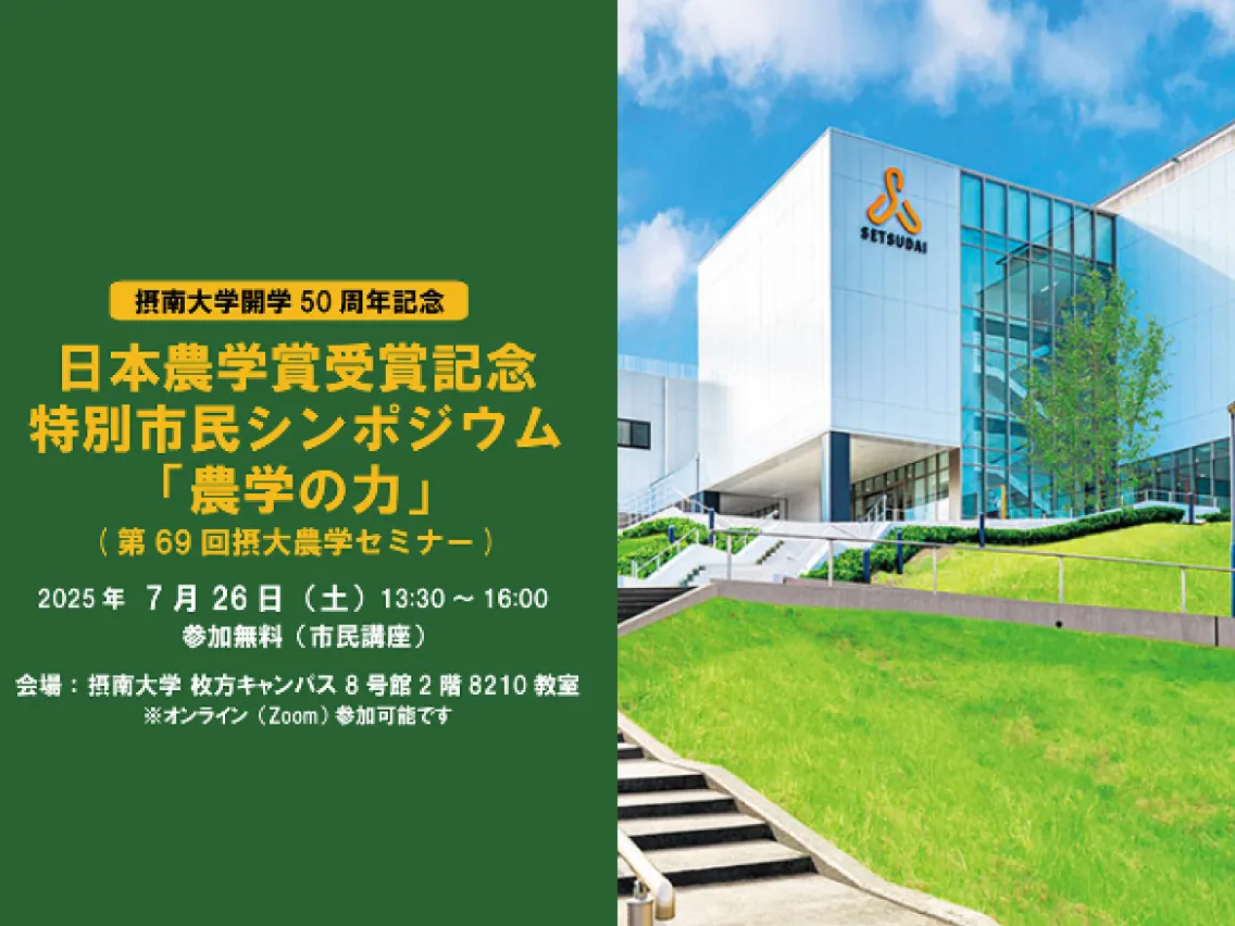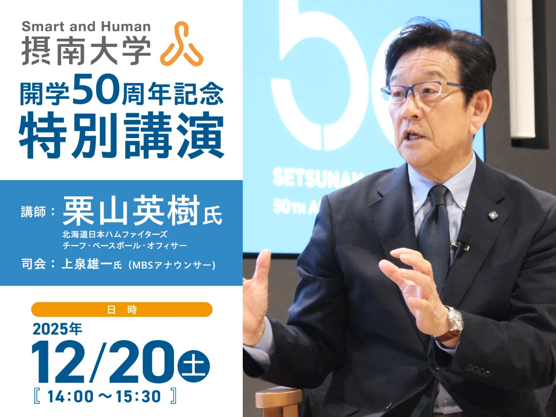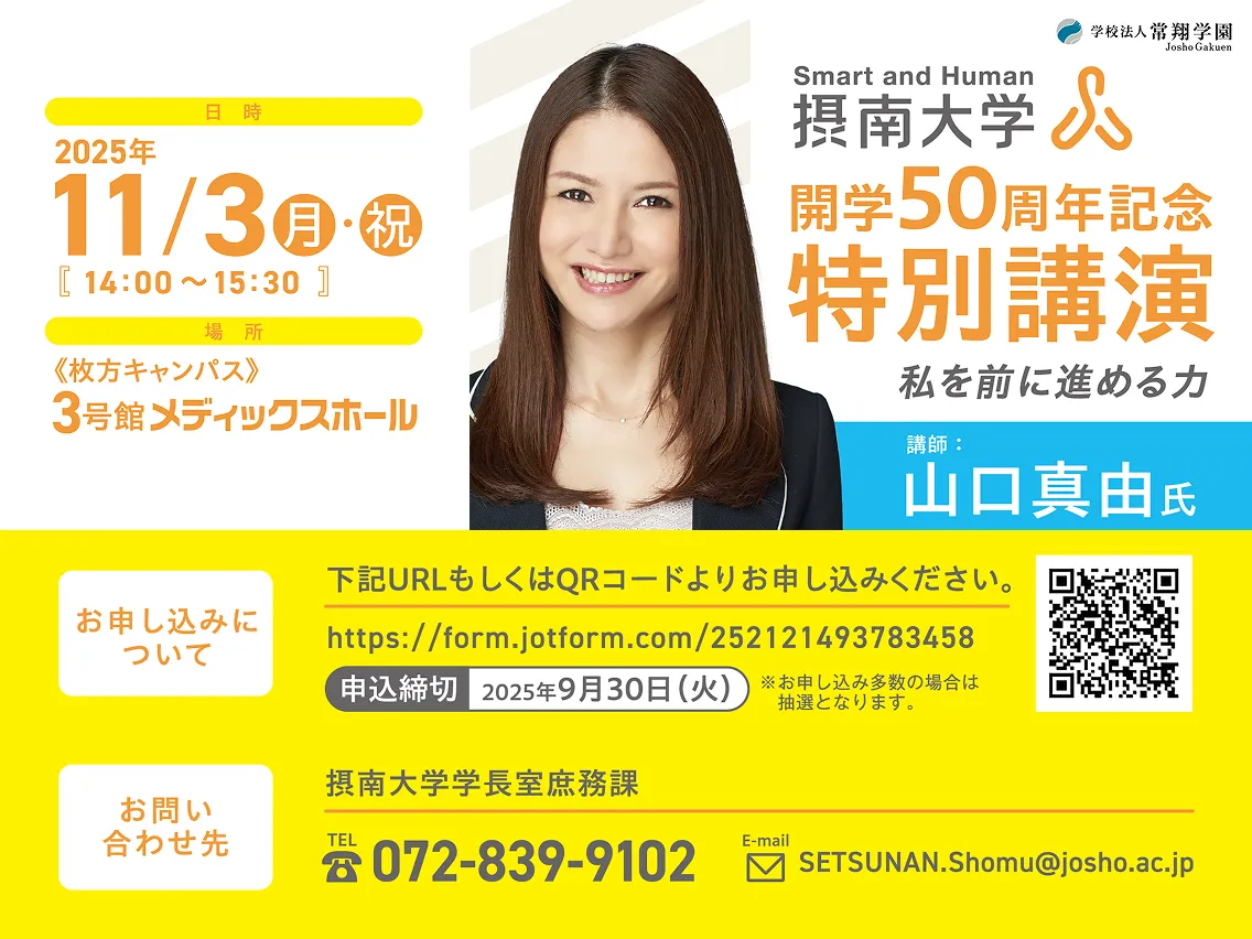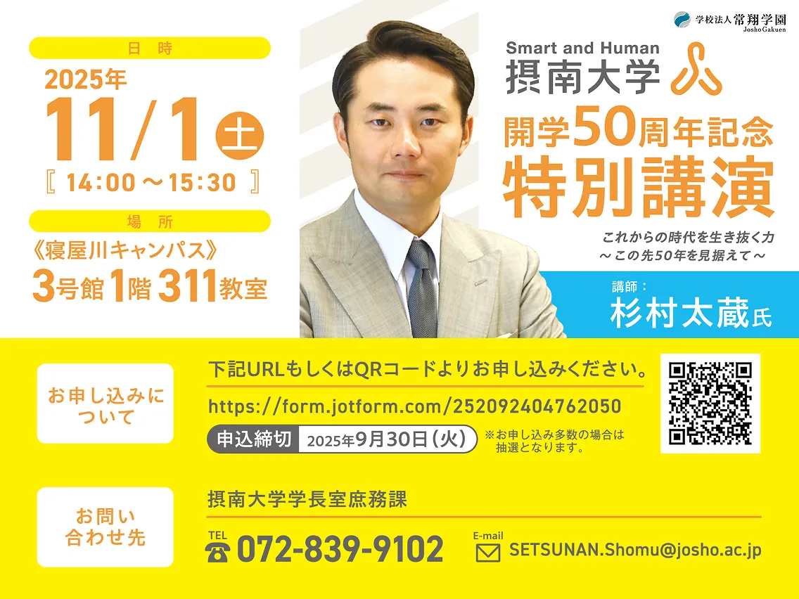 摂南大学は1975年の開学以来、多くの学生が学び、成長し、社会へと羽ばたいてきました。2025年、私たちは開学50周年を迎えました。この半世紀を支えてくださった卒業生、保証人、地域のみなさま、そして日々を共にする学生と教職員に、心より感謝申し上げます。