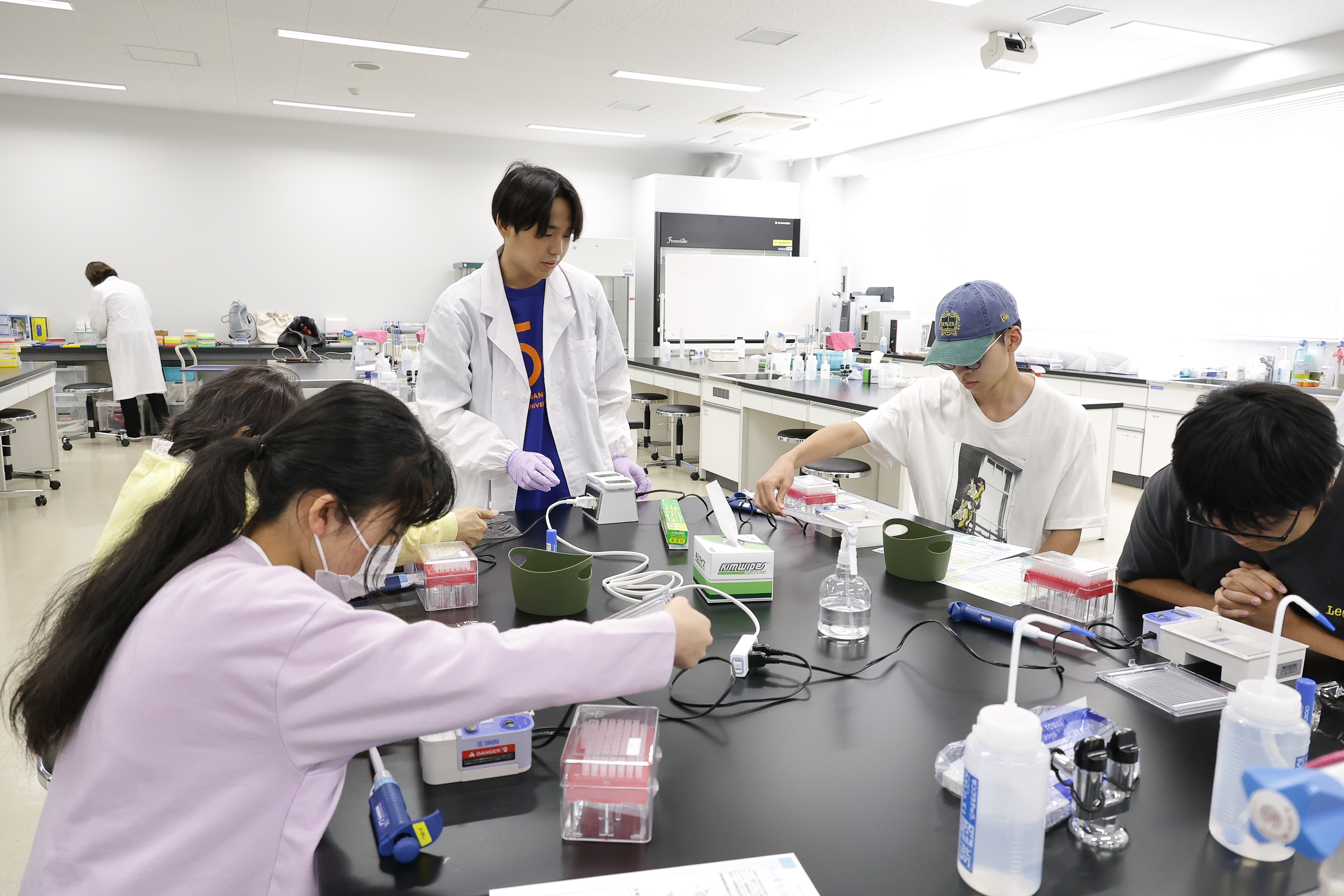 オープンラボや実習体験では、摂南大生がスタッフメンバーとしてプログラムを丁寧に、楽しくサポートします。初めての実験や実習でも心配いりません。学生と一緒に体験できるので、安心してご参加ください。