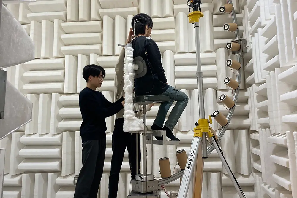 音をデジタル化しパソコン上で扱うことにより,様々な加工が可能になります。例えば行ったことのないコンサートホールの響きを実験室に再現したり、到来する音を逆位相の音で打ち消したり、選択した音を頭の周りでぐるぐる動かしたり、私たちが今まで想像もしていなかった技術を生み出すことができます。デジタル音響研究室では、まだ世の中にない価値を見出し、音と信号処理技術で実現していく研究室です。この分野のいいところは自分のアイディアをコード化し、プログラムを実行すれば自分の耳でそのアイディアの正当性を聞けることです。例えば斬新なノイズキャンセリングのアイディアが降ってきて、コードを書いて「実行」をクリックすれば「全然消えねー」か「本当に消えてる!」が分かります。後者だった時の快感は言葉にできません。研究室に来る皆さんにも味わって欲しい感動です。