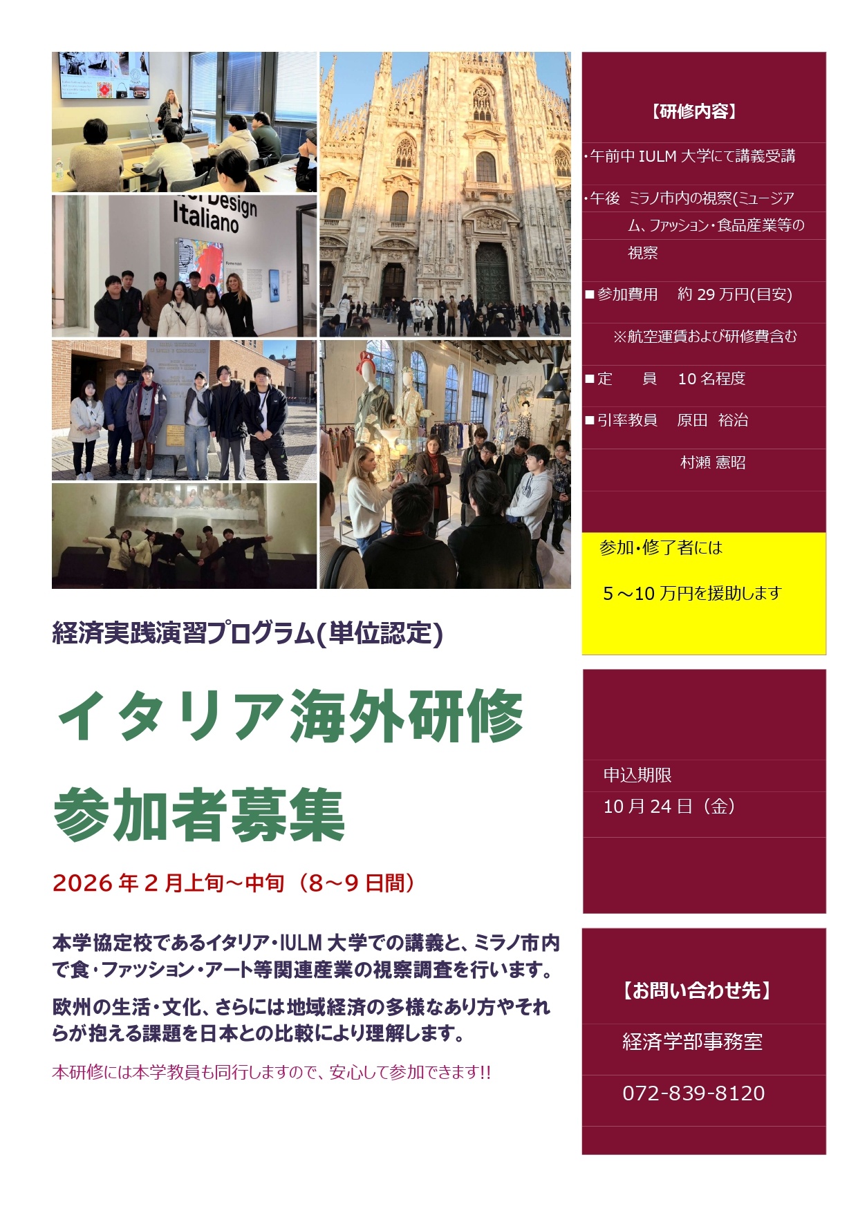 ▶お知らせ経済学部主催 イタリア研修の参加者募集について