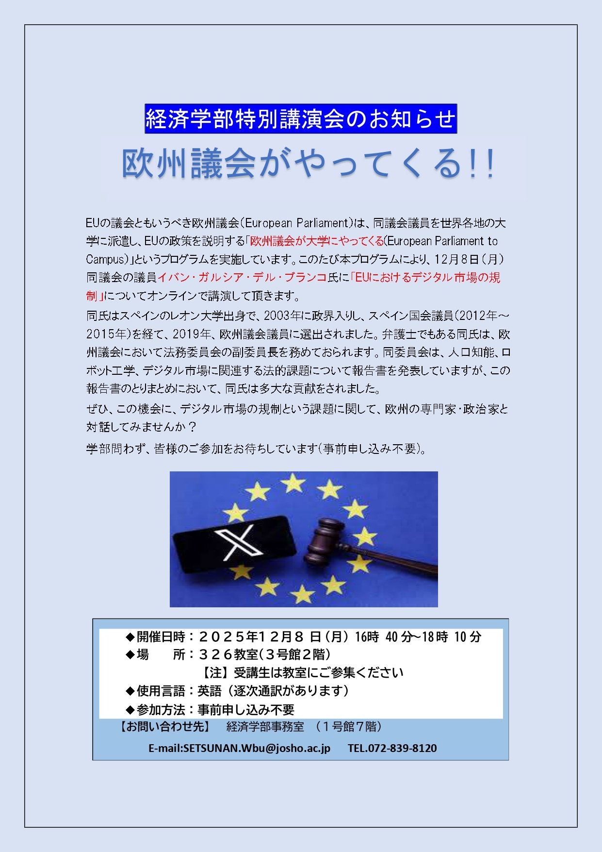 EUの議会ともいうべき欧州議会(European Parliament)は、同議会議員を世界各地の大学に派遣し、EUの政策を説明する「欧州議会が大学にやってくる (European Parliament to Campus)」というプログラムを実施しています。このたび本プログラムにより、12月8日(月)、同議会の議員イバン・ガルシア・デル・ブランコ氏に「EUにおけるデジタル市場の規制」についてオンラインで講演して頂きます。 同氏はスペインのレオン大学出身で、2003年に政界入りし、スペイン国会議員(2012年~2015年)を経て、2019年、欧州議会議員に選出されました。弁護士でもある同氏は、欧州議会において法務委員会の副委員長を務めておられます。同委員会は、人口知能、ロボット工学、デジタル市場に関連する法的課題について報告書を発表していますが、この報告書のとりまとめにおいて、同氏は多大な貢献をされました。 ぜひ、この機会に、デジタル市場の規制という課題に関して、欧州の専門家・政治家と対話してみませんか? 学部問わず、皆様のご参加をお待ちしています(事前申し込み不要)。