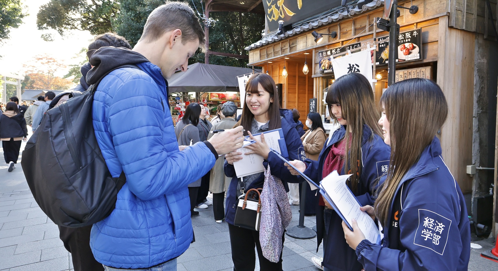 そこで、この課題に対して、名方ゼミでは3つのグループに分かれて調査を実施しました。 第1グループは、外国人観光客を対象に調査を行いました。内容は、出身地や日本のゴミや環境マナーについての質問、さらに「日本に来て良かった点」についての意見を集めました。 第2グループは、レストランや土産店、食べ歩きの店などを訪れ、外国人観光客向けにどのような工夫がされているかを調査しました。 第3グループは、伊勢の歴史と観光客数、そして地域の経済(県内総生産)との関係性について調査しました。