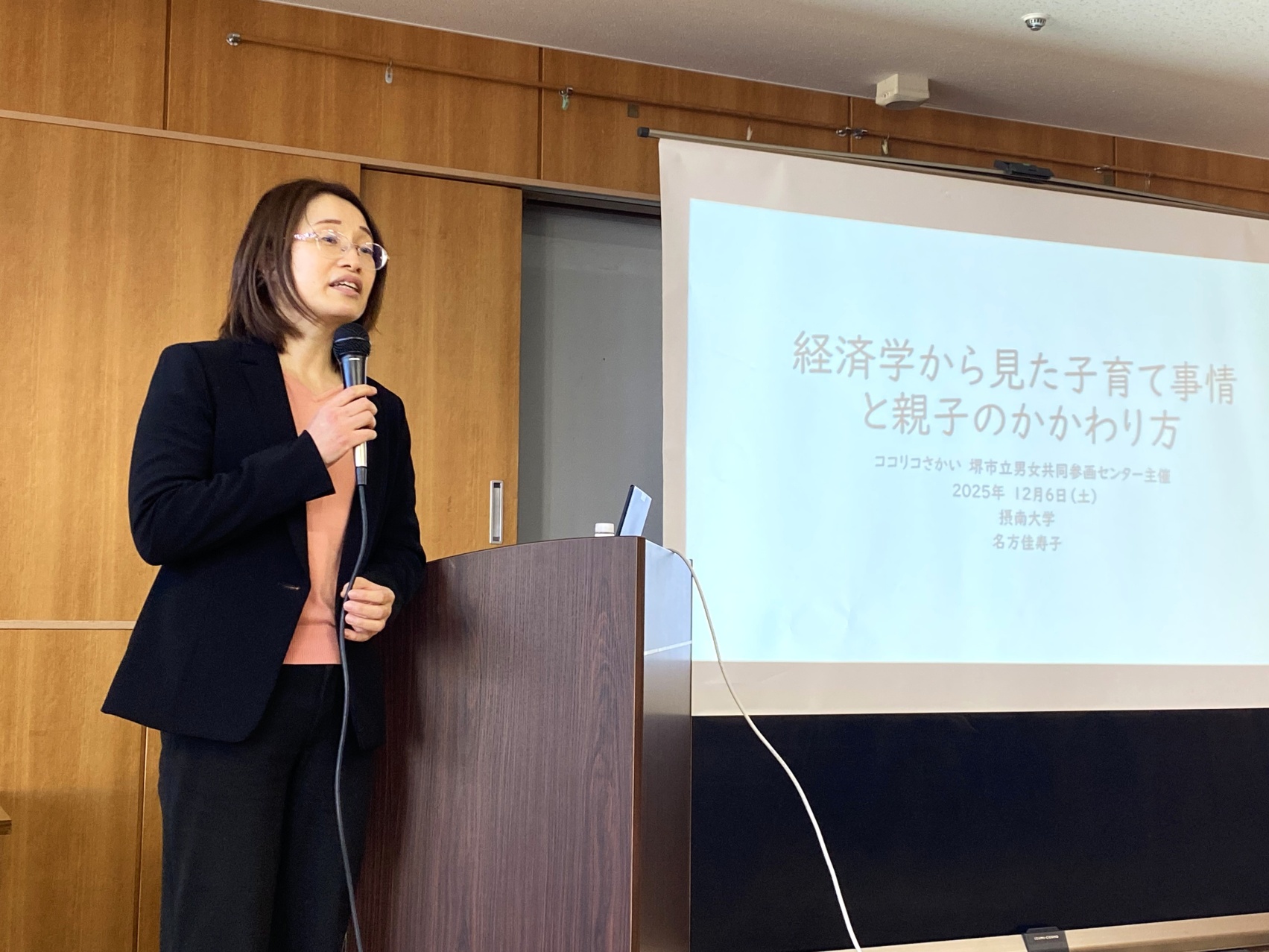 12月6日、経済学部の名方佳寿子准教授が堺市立男女共同参画センターコクリコさかい:堺自由の泉大学において『経済学から見た子育て事情と親子のかかわり方』というテーマで市民100名を対象に講演を行いました。