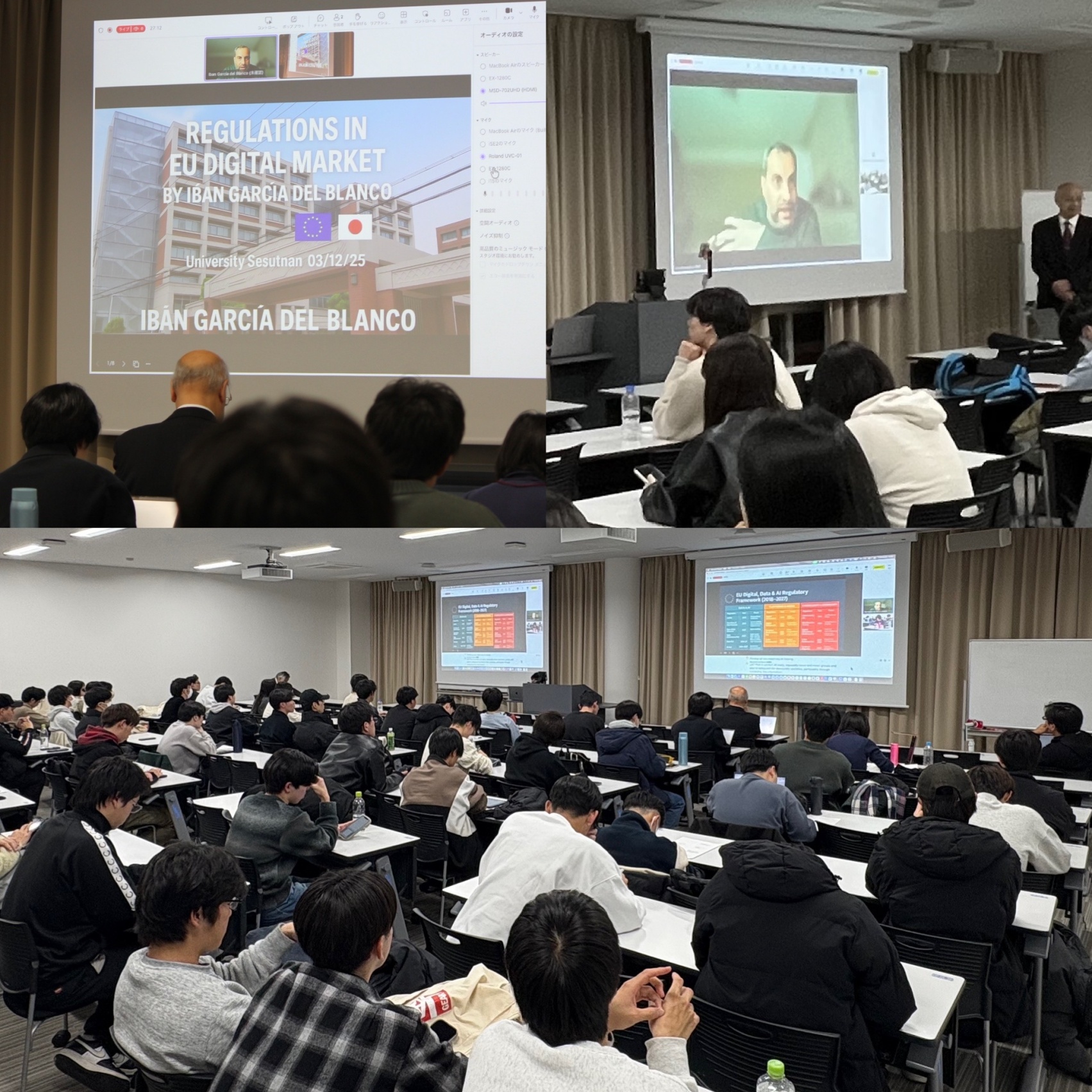 EUの議会にあたる欧州議会は、同議会議員あるいは元議員を世界各地にある大学に派遣し、EUの政策を説明し、学生と対話するという「欧州議会がやってくる!!(European Parliament to Campus)」というプログラムを実施しています。 このプログラムにより、12月8日、経済学部において、「欧州議会が摂南大学にやってくる(European Parliament to Setsunan Campus!! )」と名付けた特別講演会を実施しました。講師は同議会の元議員イバン・ガルシア・デル・ブランコ氏で、「EUにおけるデジタル市場の規制」をテーマとし、ブリュッセルとオンラインで結んで講演していただきました。なお、同氏はスペインのレオン大学出身で、2003年に政界入りし、スペイン国会議員(2012年~2015年)を経て、2019~2024年の間、欧州議会議員に選出されました。弁護士でもある同氏は、欧州議会において法務委員会の副委員長を務められました。