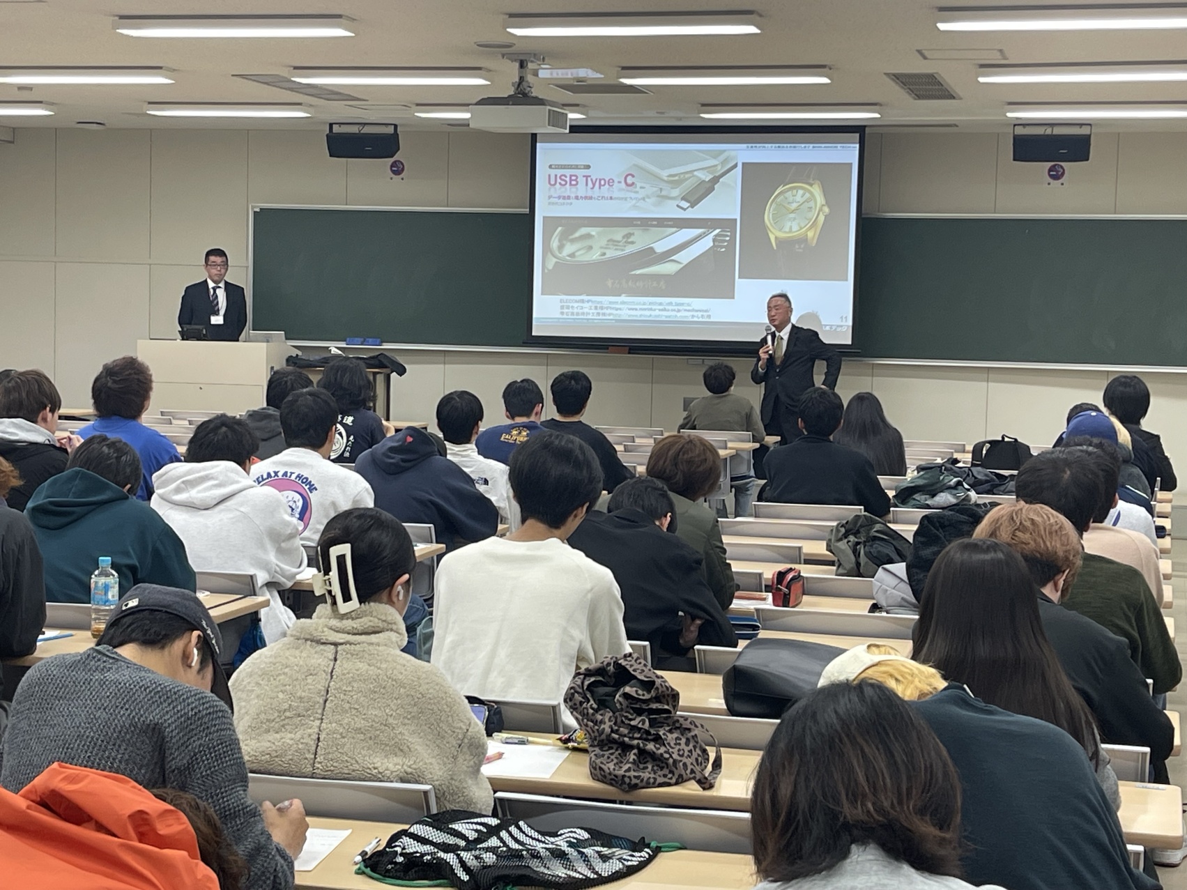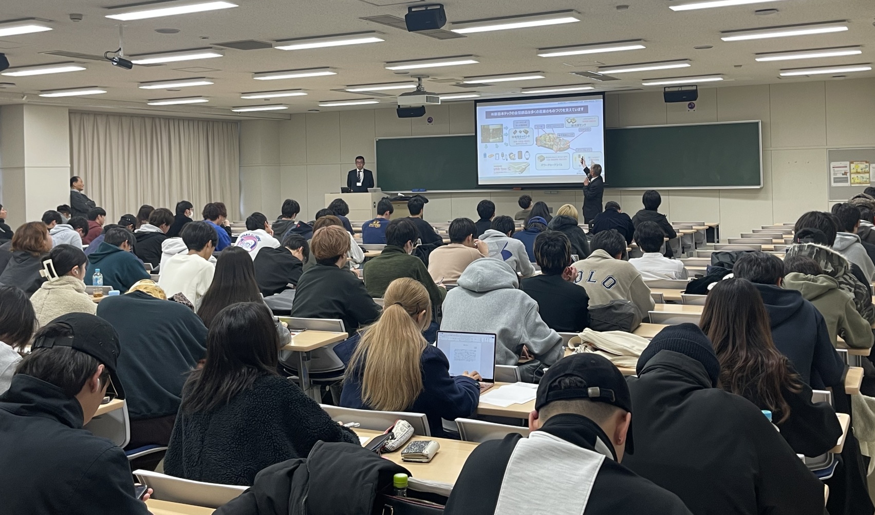 11月26日、授業「関西経済論」(担当:野長瀬裕二教授)において、株式会社新日本テックの代表取締役である和泉康夫氏と、同社勤務で本学経済学部OBの松田将昂氏をお招きしてご講演いただきました。