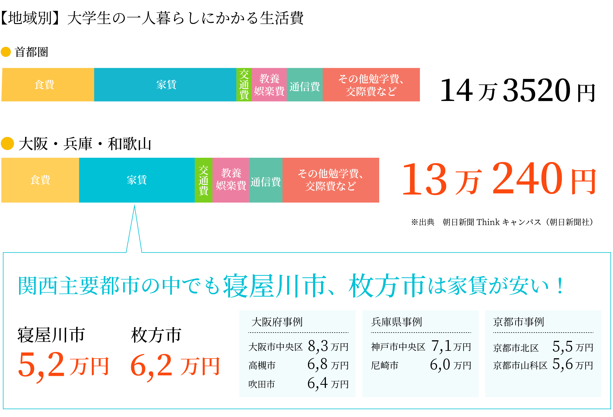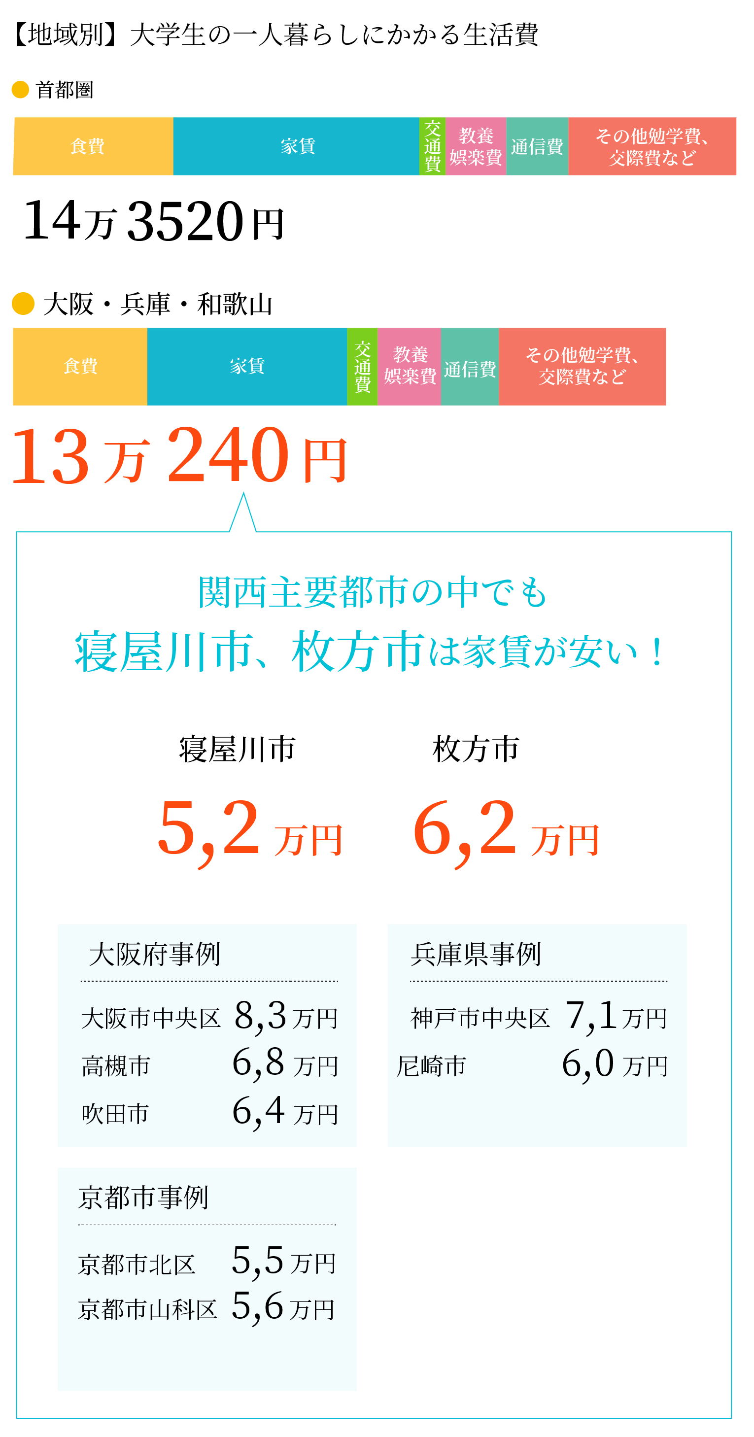関東と比べ、月額でかかる生活費が