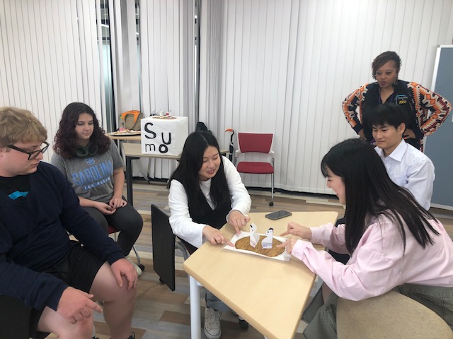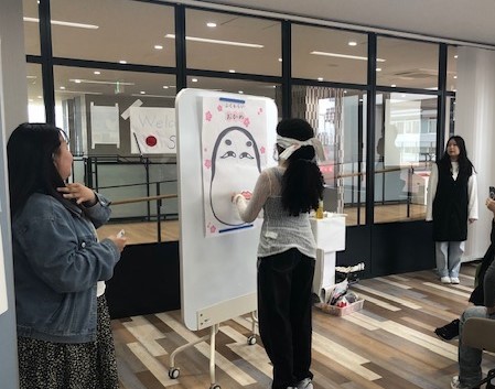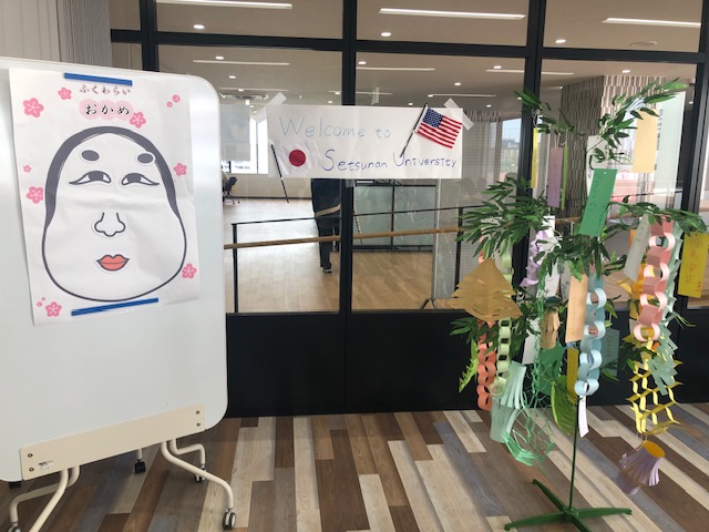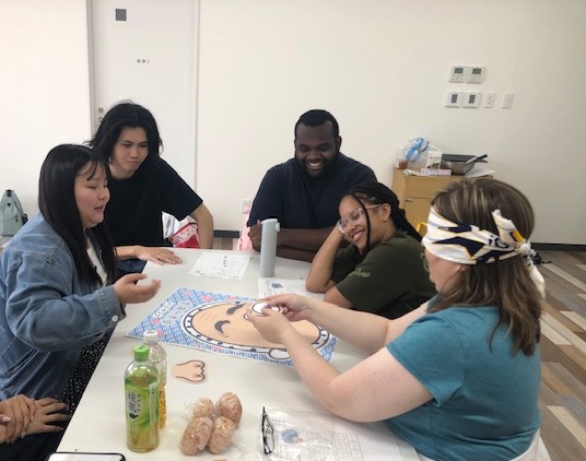 日本語学習歴のないアメリカの学生の皆さんに簡単な日本語を教えて、日本文化を紹介するアクティビティーとして、「福笑い・紙相撲・七夕の飾り作成」を行いました。