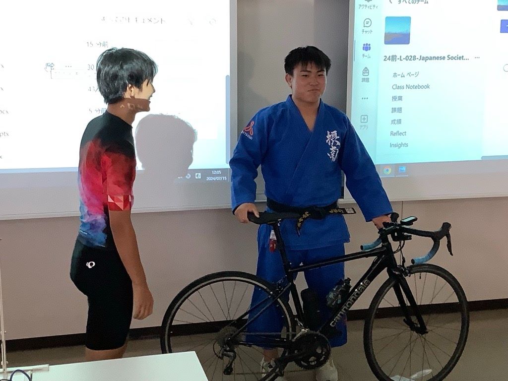画像は、ロードバイクの実物を使った発表の様子です。先に発表を終えた学生が、黒子(くろこ)のようにアシスタントを務めてくれました。