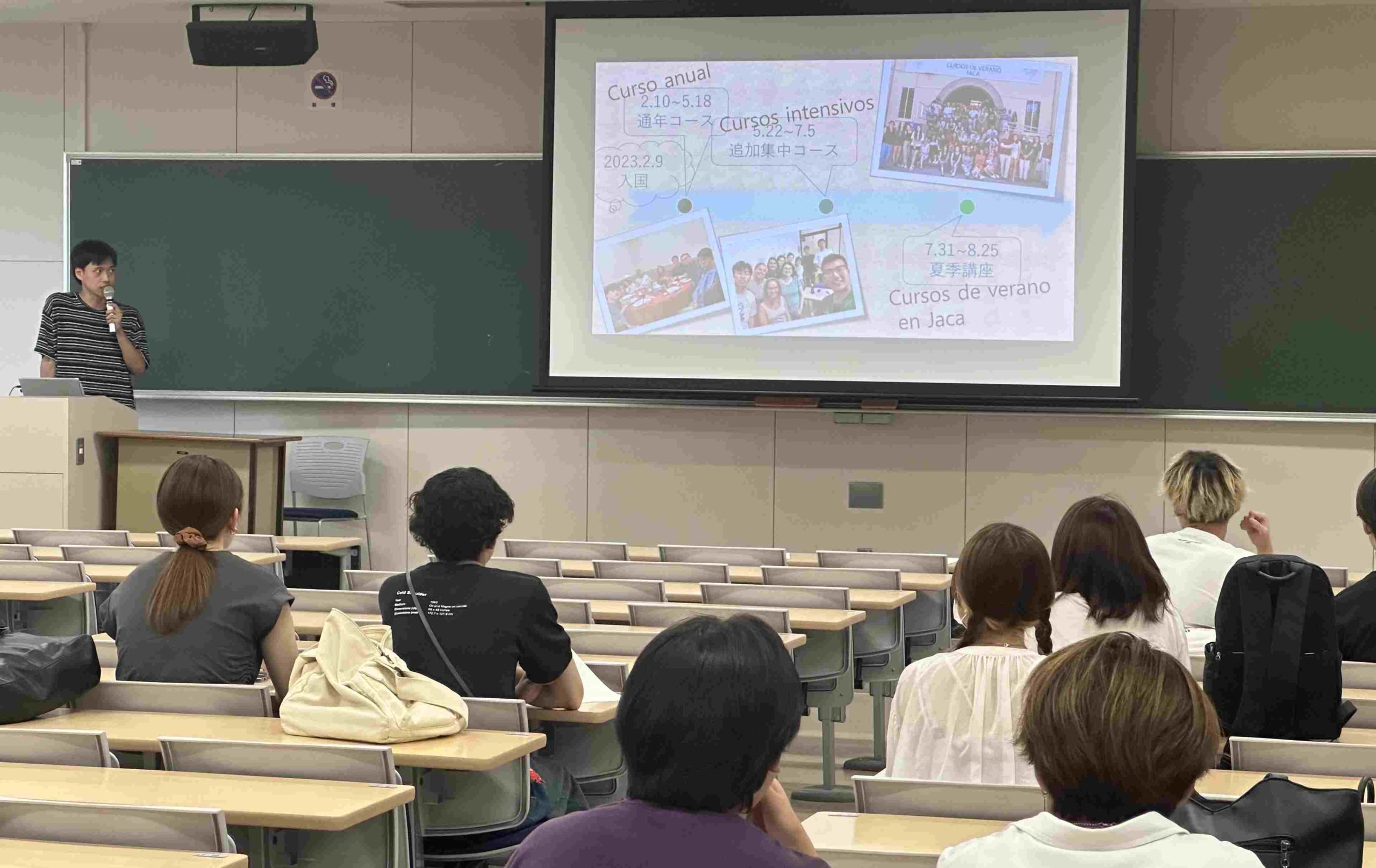 サラゴサ大学での1年間の留学から帰国した学生は、サラゴサがキリスト教文化とイスラム教文化が混じり合う街であることを紹介したあと、参加したコースの授業やクラスメイトとの交流、ホームステイでの生活や学外でのイベント等について、美しい写真を使って報告しました。また、夏の暑さと冬の寒さがどちらも厳しいので、しっかり対策してほしいと後輩の学生たちにアドバイスしました。