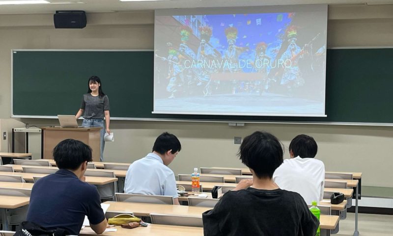 2024年7月25日(木)、国際学部3年生科目の「スペイン語を通して学ぶラテンアメリカ社会」の授業においてラテンアメリカの社会文化についてのプレゼンテーションコンテストを実施しました。この授業はスペイン語を学びながら、スペイン語圏であるラテンアメリカの社会文化を深く知ることを目的としています。学期の終盤には各自が特に興味を持った事象を探究し、スペイン語で発表しました。
