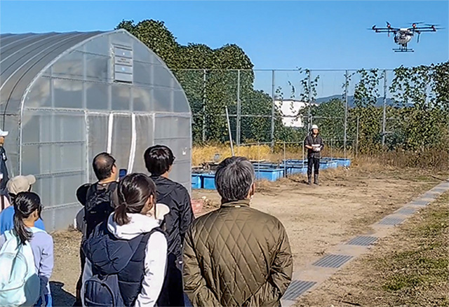 農業生産学科の教員や附属農場の技術職員による説明を受けながら、参加した小学生たちは、耕運機などの農業機械だけでなく、農産散布用ドローンの飛行を見たり、ラジコン草刈り機を実際に操作したりして、これからの農業を支える先端機械についても学びました。