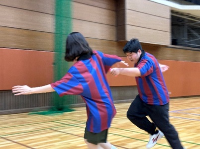 この運動会は企画、立案、進行などすべて学生が主体となって運営します。当日は準備体操にはじまり、バスケットボール、ドッジビー、ゼミ対抗リレーの3種目が用意され、学生らは白熱の競技を存分に楽しみました。