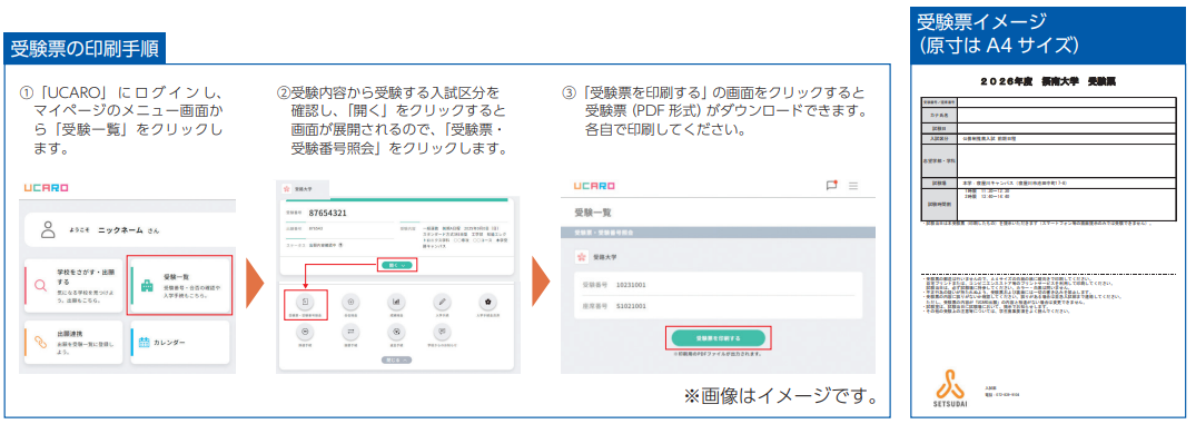 受験票は郵送しません。受験ポータルサイトUCAROに受験票(PDF形式)を発行します。