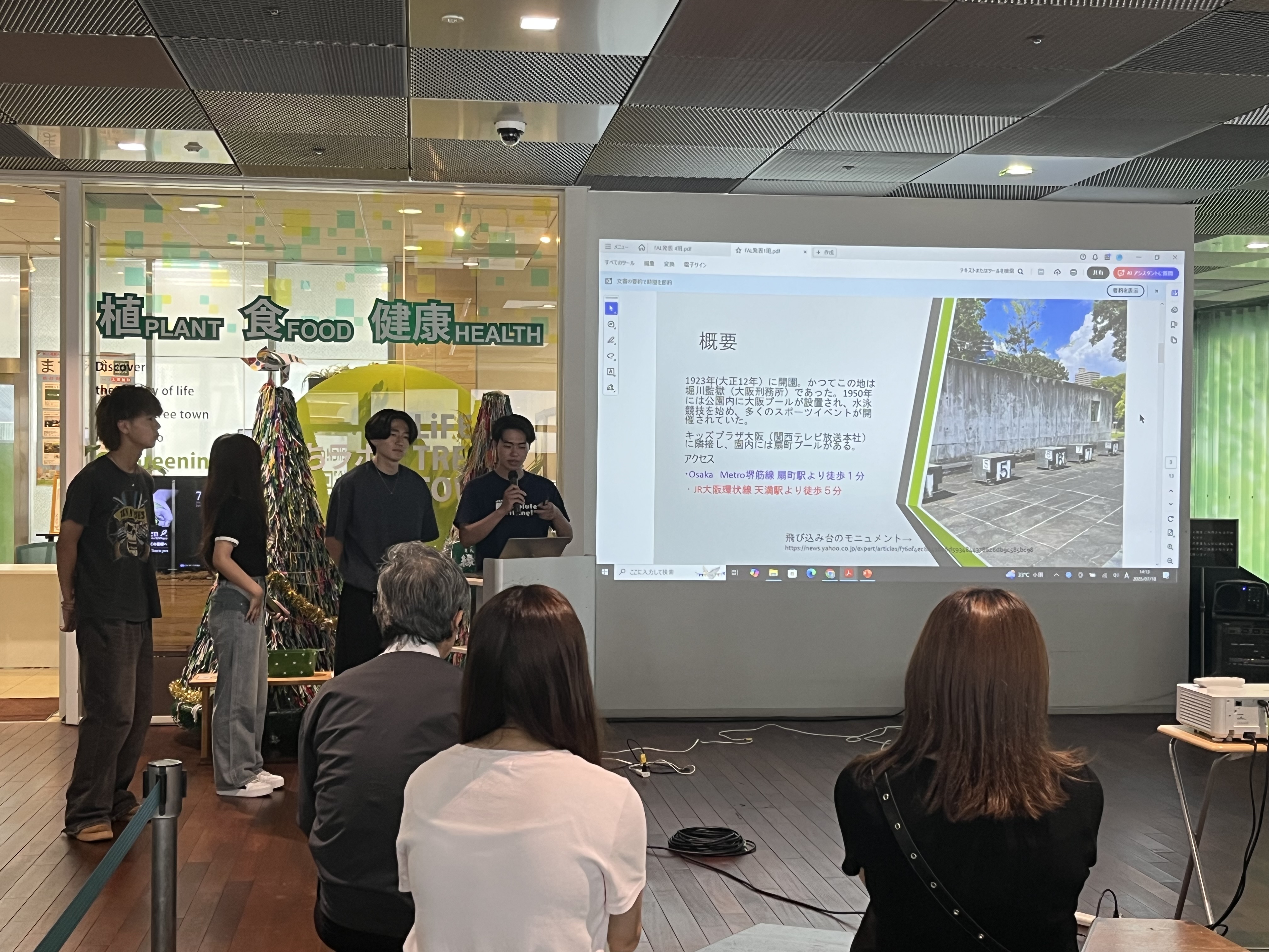 7月18日(金)に、「扇町公園について」「公園でのイベントについて」「天神橋筋商店街について」「商店街でのイベントについて」というタイトルで口頭発表を行っています。