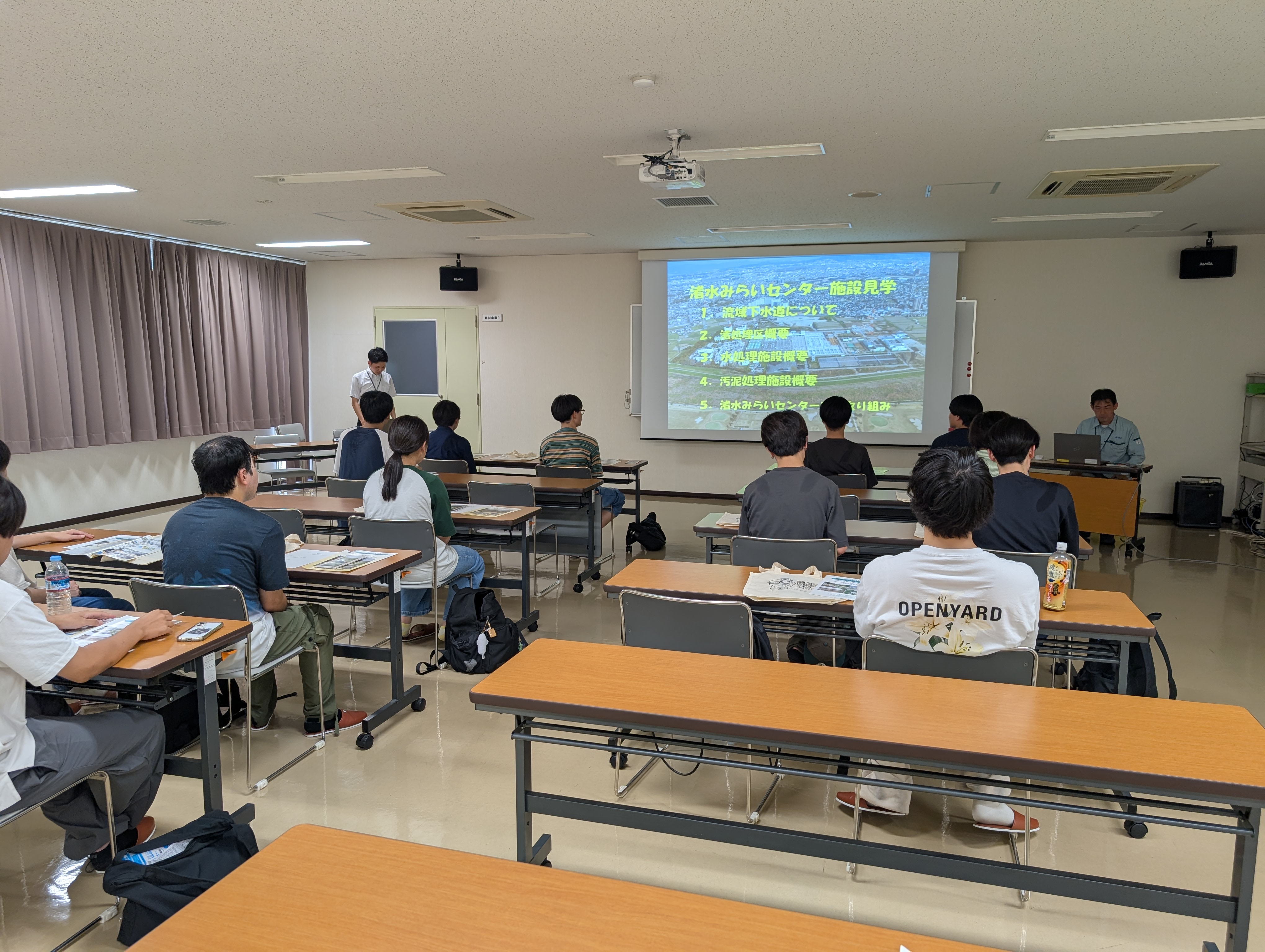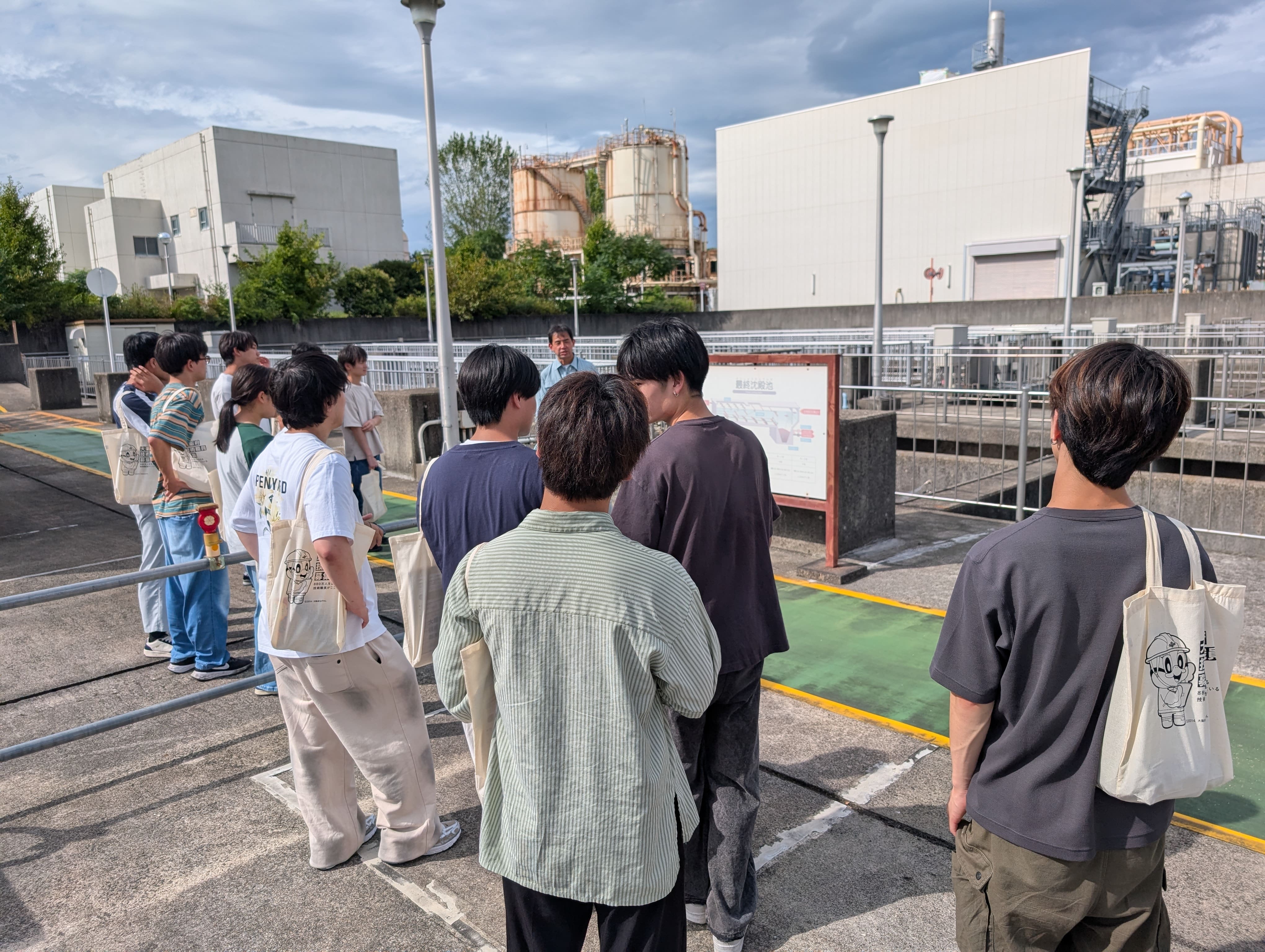 はじめに、施設概要について資料を用いたご説明をいただき、その後、水処理施設や汚泥処理施設などの現場を見学しました。さらに、近隣住民に開放されている公園などの施設についても紹介していただきました。