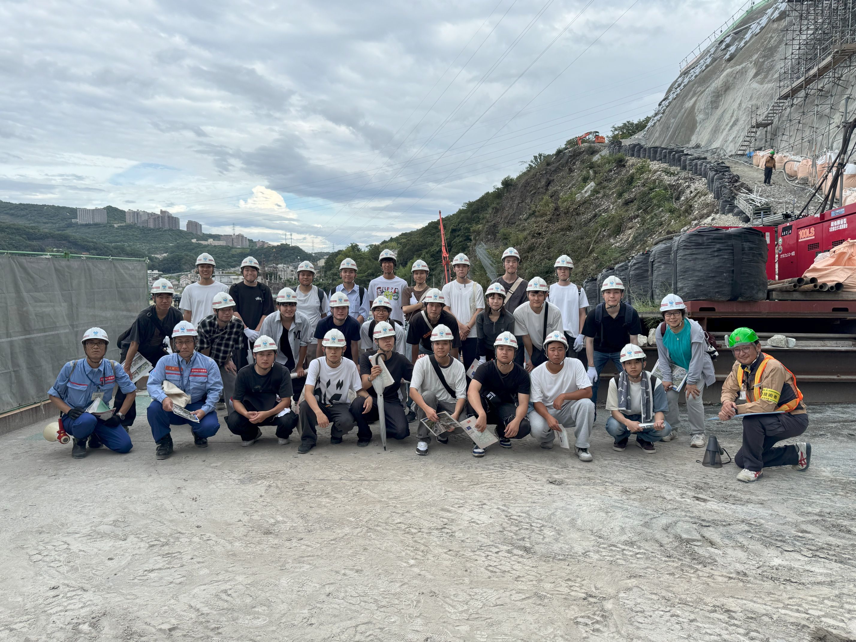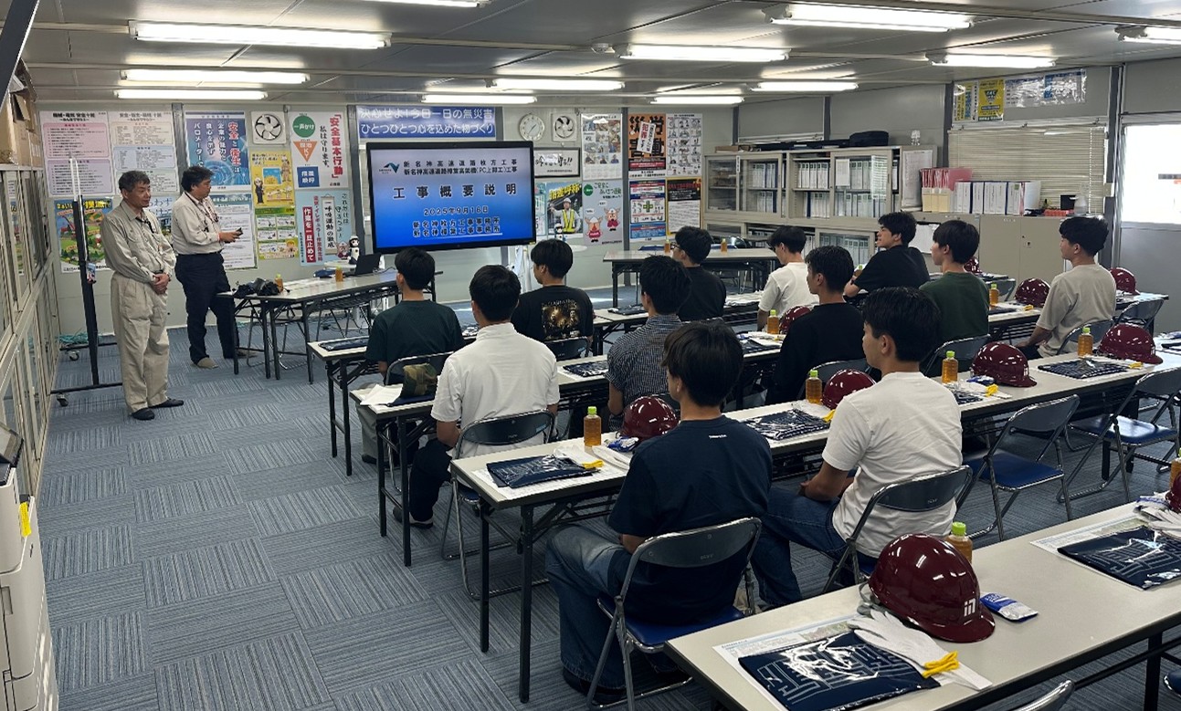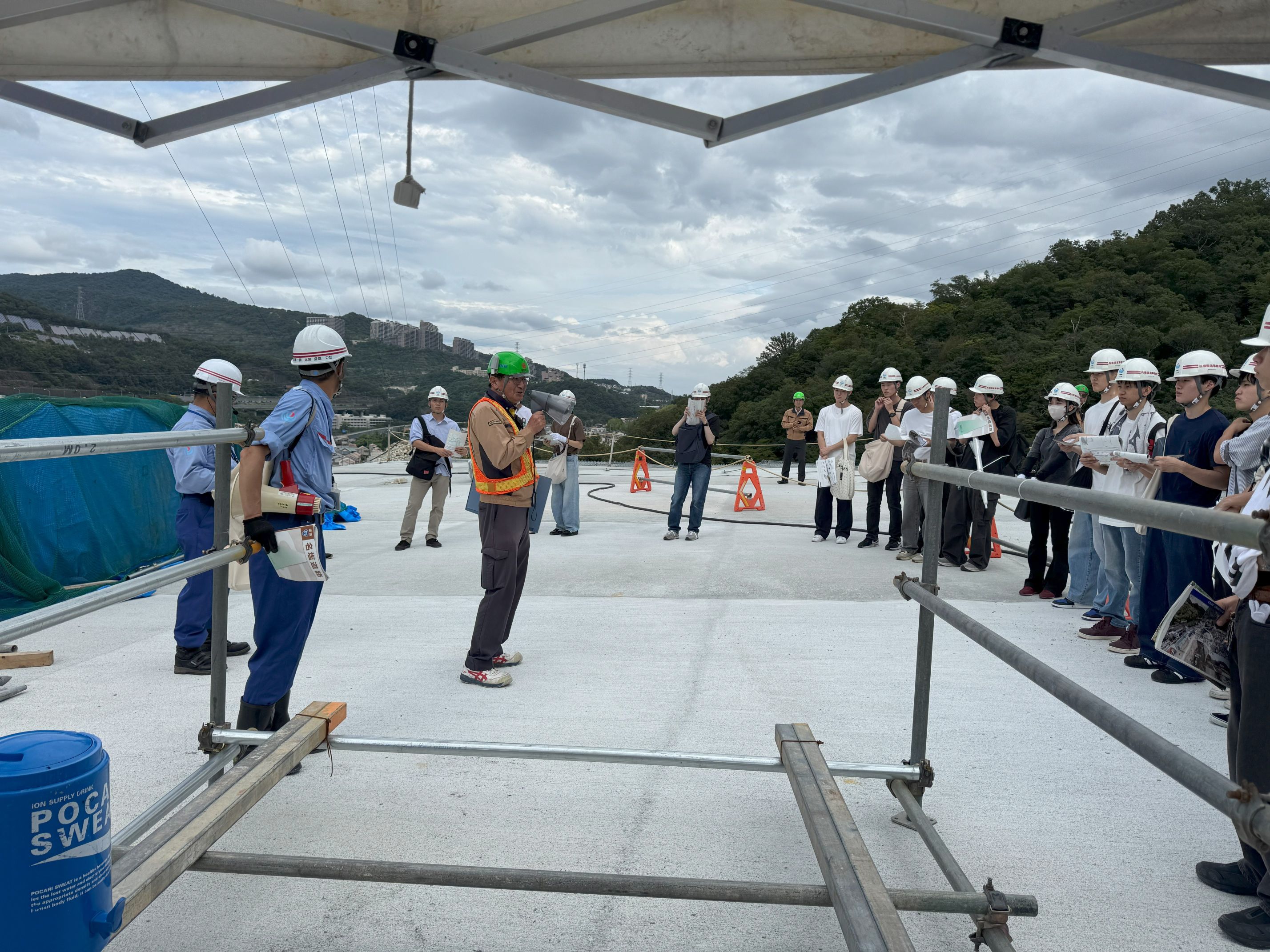 はじめに、現場所長と説明用ロボットによる工事概要説明を受けた後、施工中の区間が一望できる桟橋上の小屋に向かいました。そこでは、手持ちのタブレットを通して写る目の前の施工場所に対し、AR技術で施工過程映像を重ねて投影できるようになっており、学生はその最新技術の活用に感嘆の声を上げていました。つぎに、シールド発進用の立坑に向かいました。そこには鉄骨の支保工が張り巡らされた深さ数十メートルの立坑があり、学生たちは地上から恐る恐る覗き込みつつ、その掘削の技術力に感心していました。最後に、施工中の橋梁上部工の上へ登り、施工の様子を見学しながら、道路の仕様や施工手順について説明をしてもらいました。