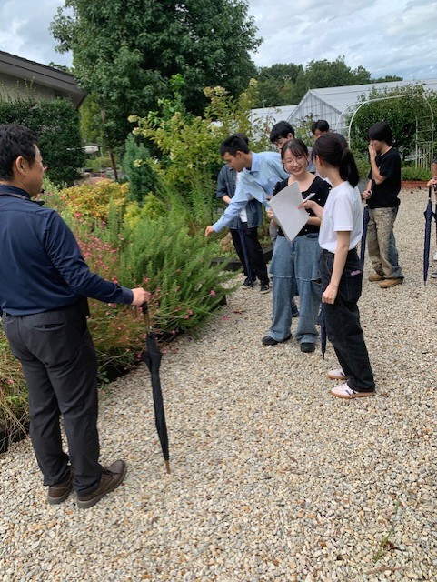前半の業務説明では、学生から業務の楽しみやかなり細部に関する質問が多く、学生の環境に対する取り組みへの関心を知ることができました。場内見学では、苗木生産ハウスでは緑化センターで開発した地被ユニットの育成、草花生産ハウス、ビオトープモデルゾーン、屋外試験エリアでの鵜殿の葦の生育を見学しました。
