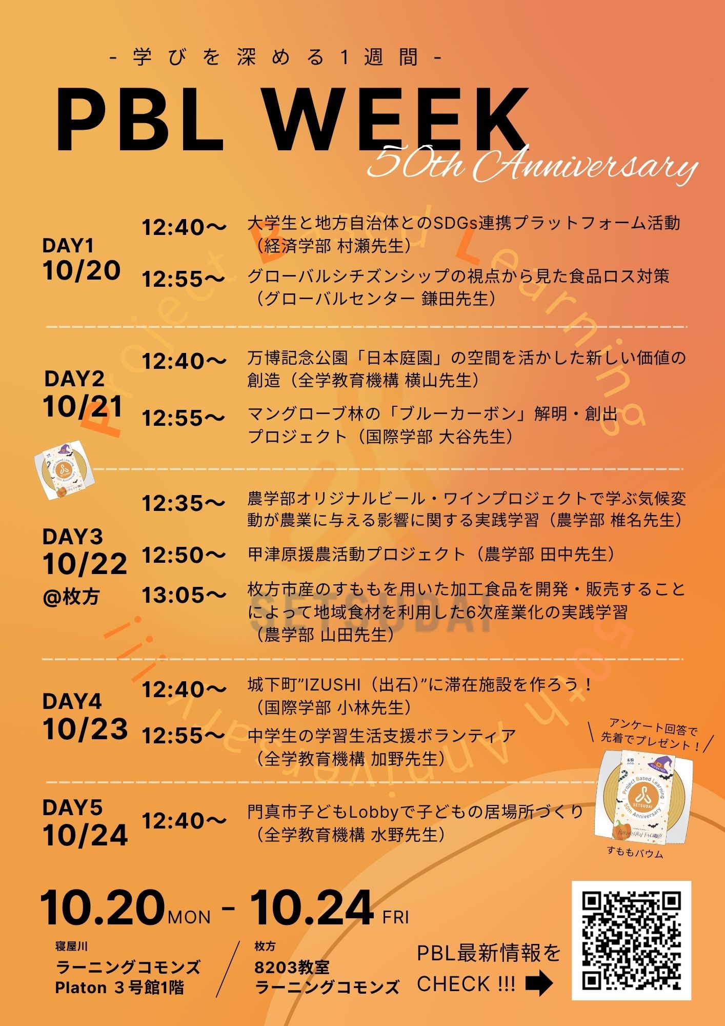また、今年度のPBL WEEKでは、2025年度PBLプロジェクトの一つである「枚方市産のすももを用いた加工食品を開発・販売し、地域食材を活用した6次産業化の実践学習」に関連する「米粉バウム」と「すももバウム」を、アンケートに回答いただけた方に先着で限定配付する予定です。(一人1つに限る)