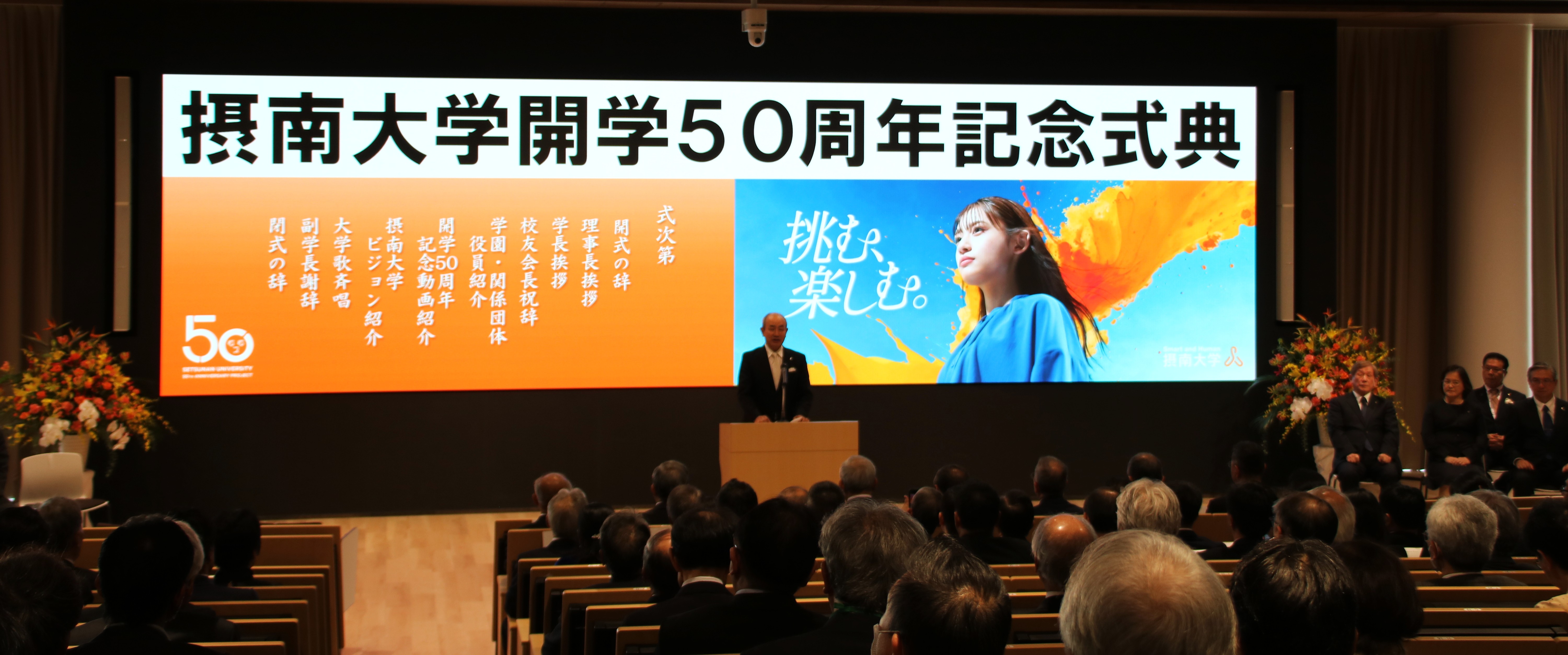 内容 :常翔学園の西村泰志理事長による挨拶に続き、久保康之学長が、50周年を迎えたことへの感謝の意を述べました。また、開学50周年を記念した動画も上映され、これまでの歩みを振り返るとともに、様々な分野で活躍しながら「挑む、楽しむ。」を体現する学生の姿が紹介されました。