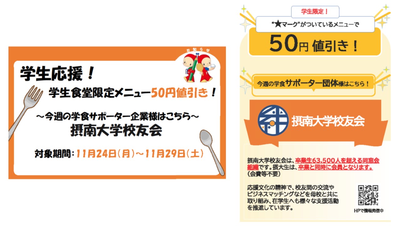 11月24日(月)から11月29日(土)まで、寝屋川キャンパス「せっちゃん食堂」と「レストラン ブォナージョ」、枚方キャンパス「枚方食堂」とレストラン「結」で、以下の企業様から協賛いただき、学生限定でメニューの値引きを行う食支援を実施します。