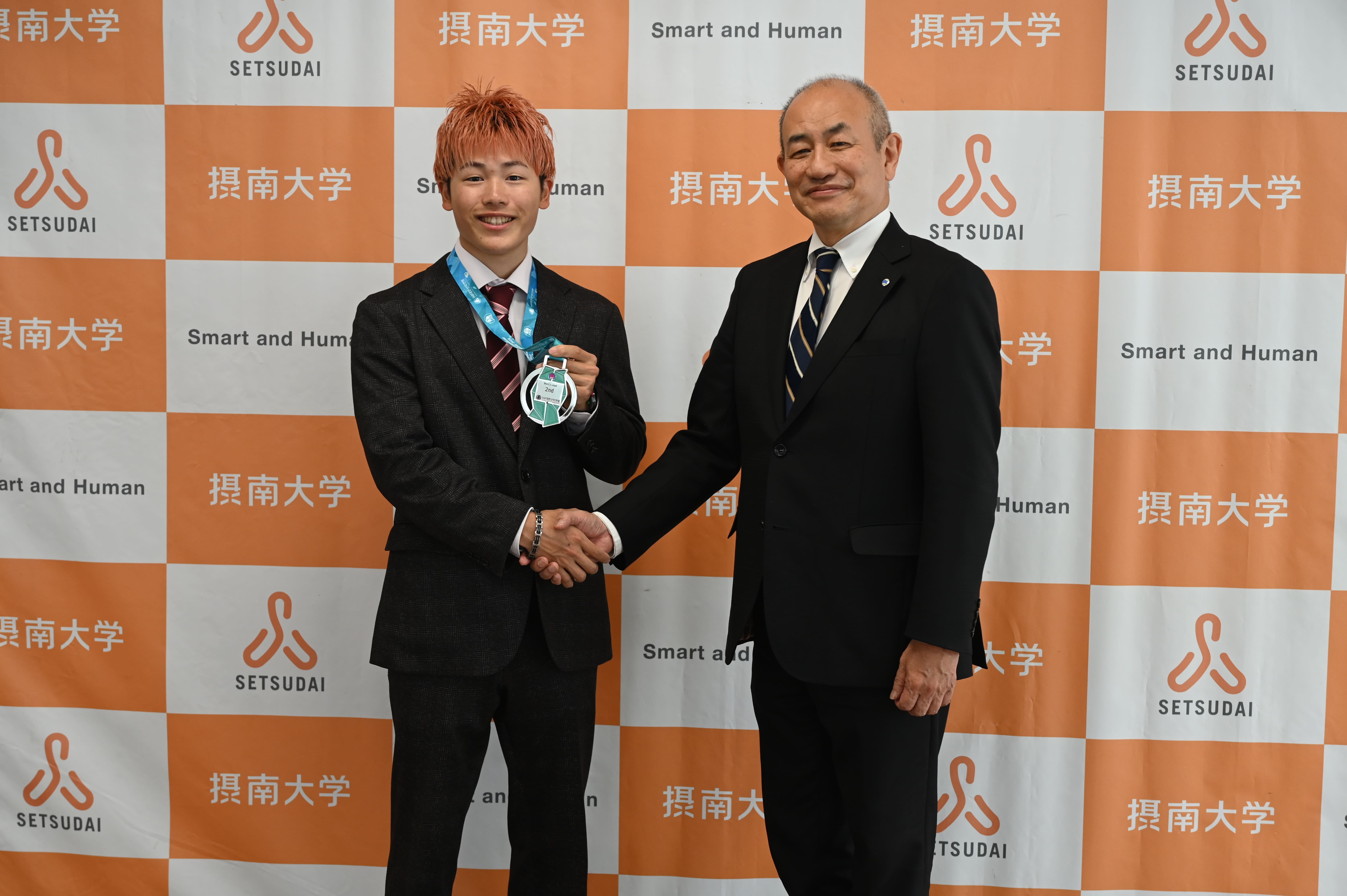 獲得したメダルを披露し、学長らに成果を報告する吉田さん