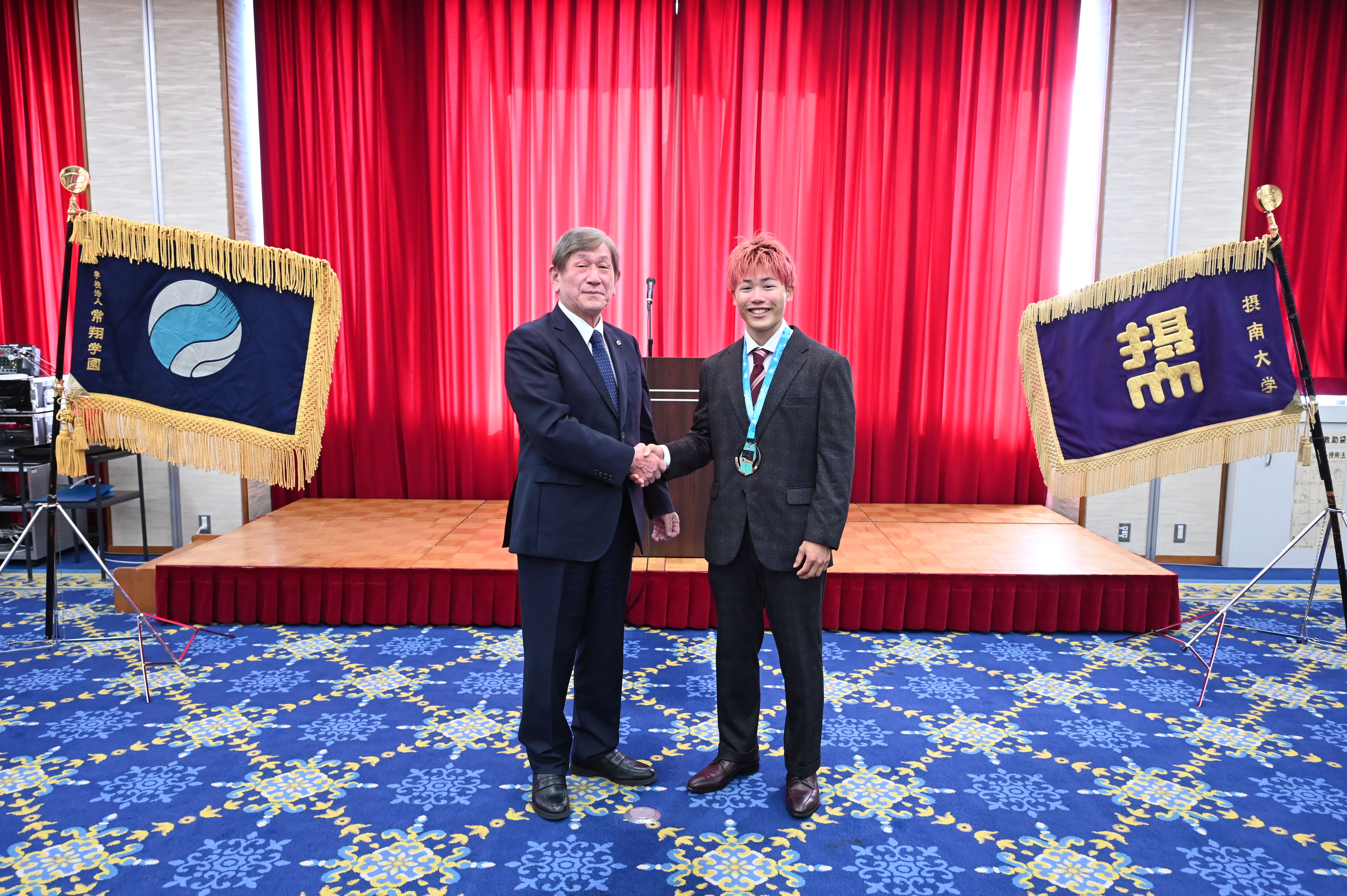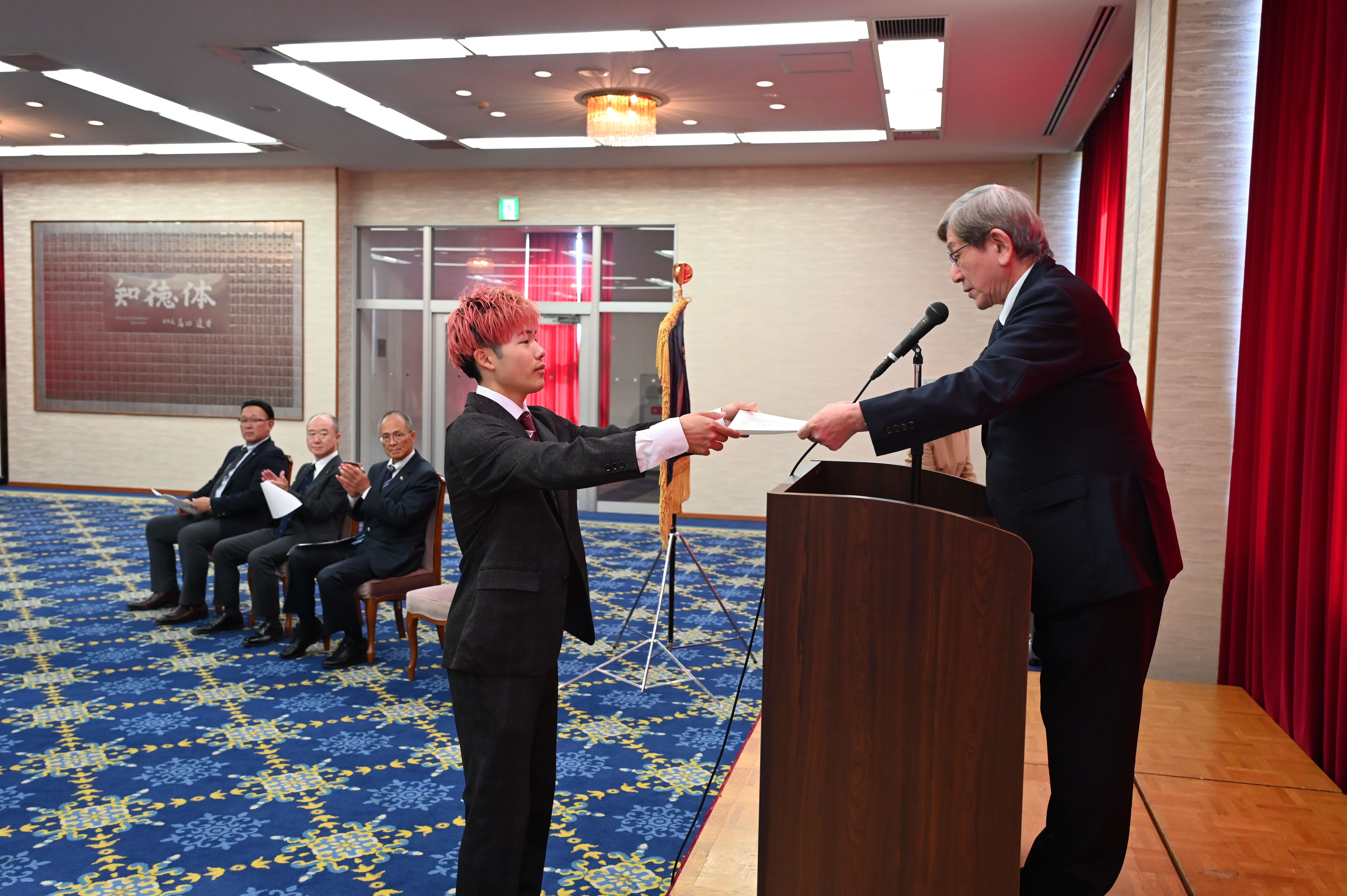 表彰にあたり常翔学園・西村理事長から、労いの言葉と今後の活躍に期待する祝辞があり、吉田さんから謝辞を述べました。