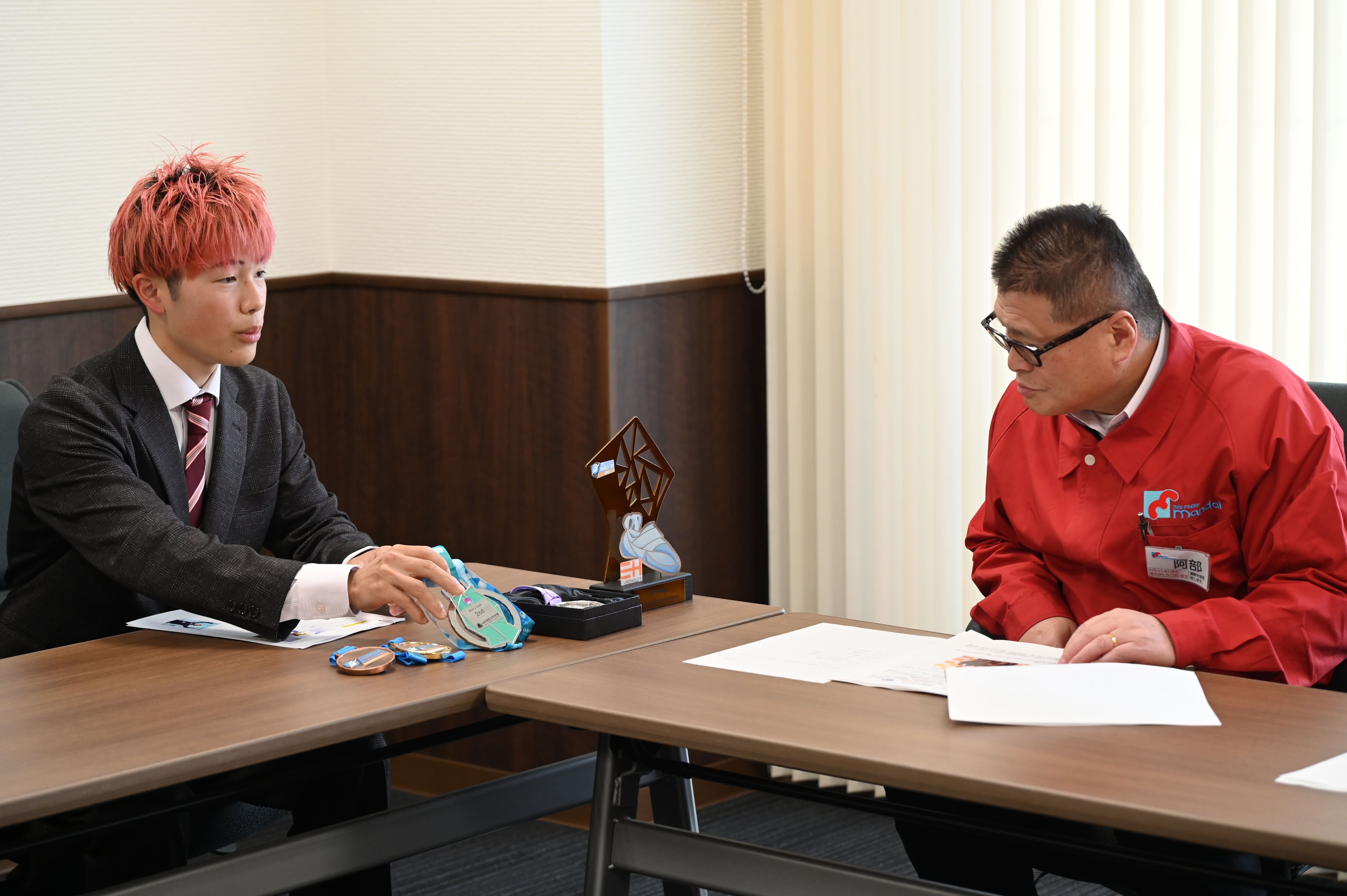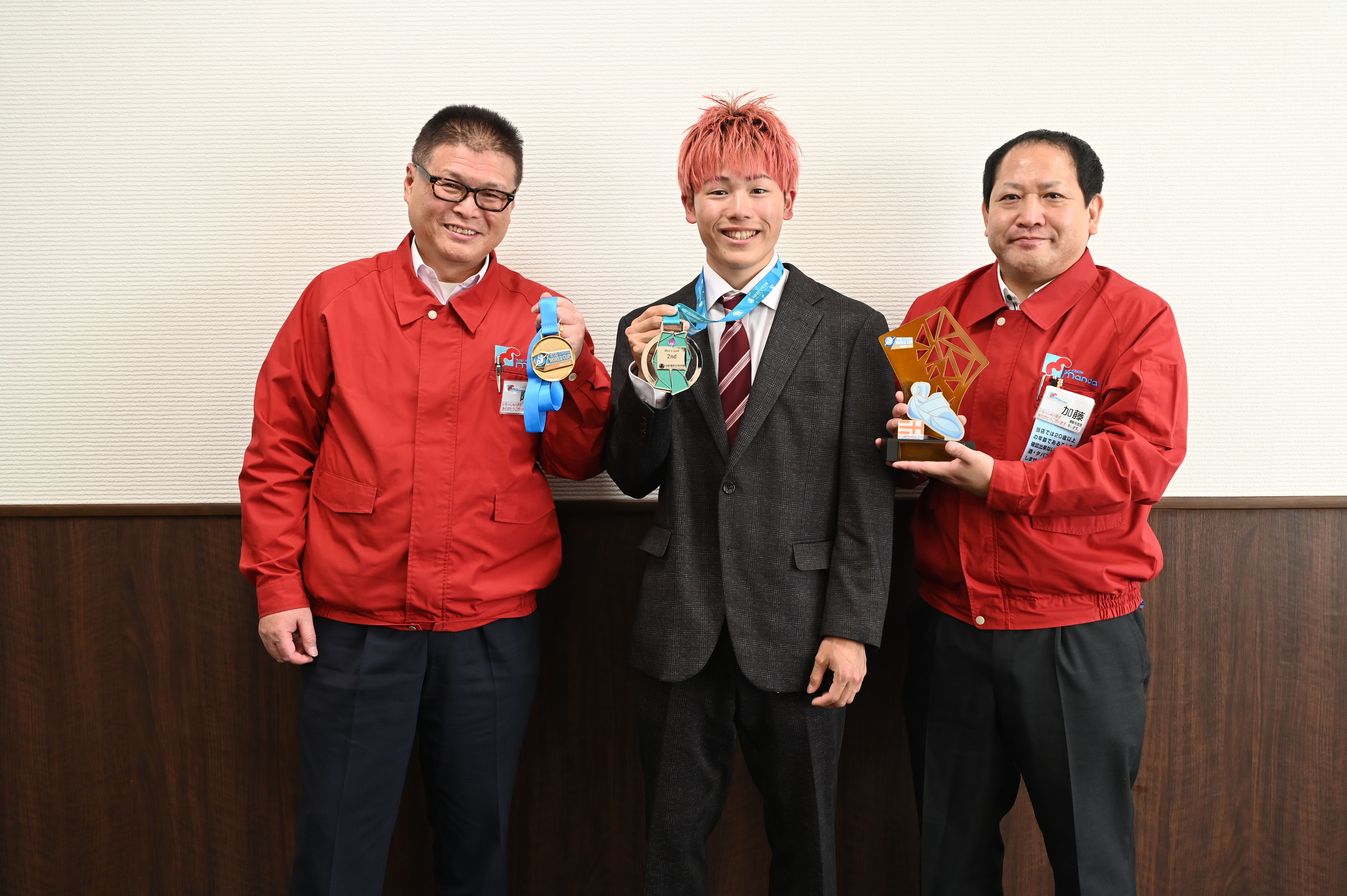 阿部代表取締役社長に獲得したメダルを披露する吉田さん