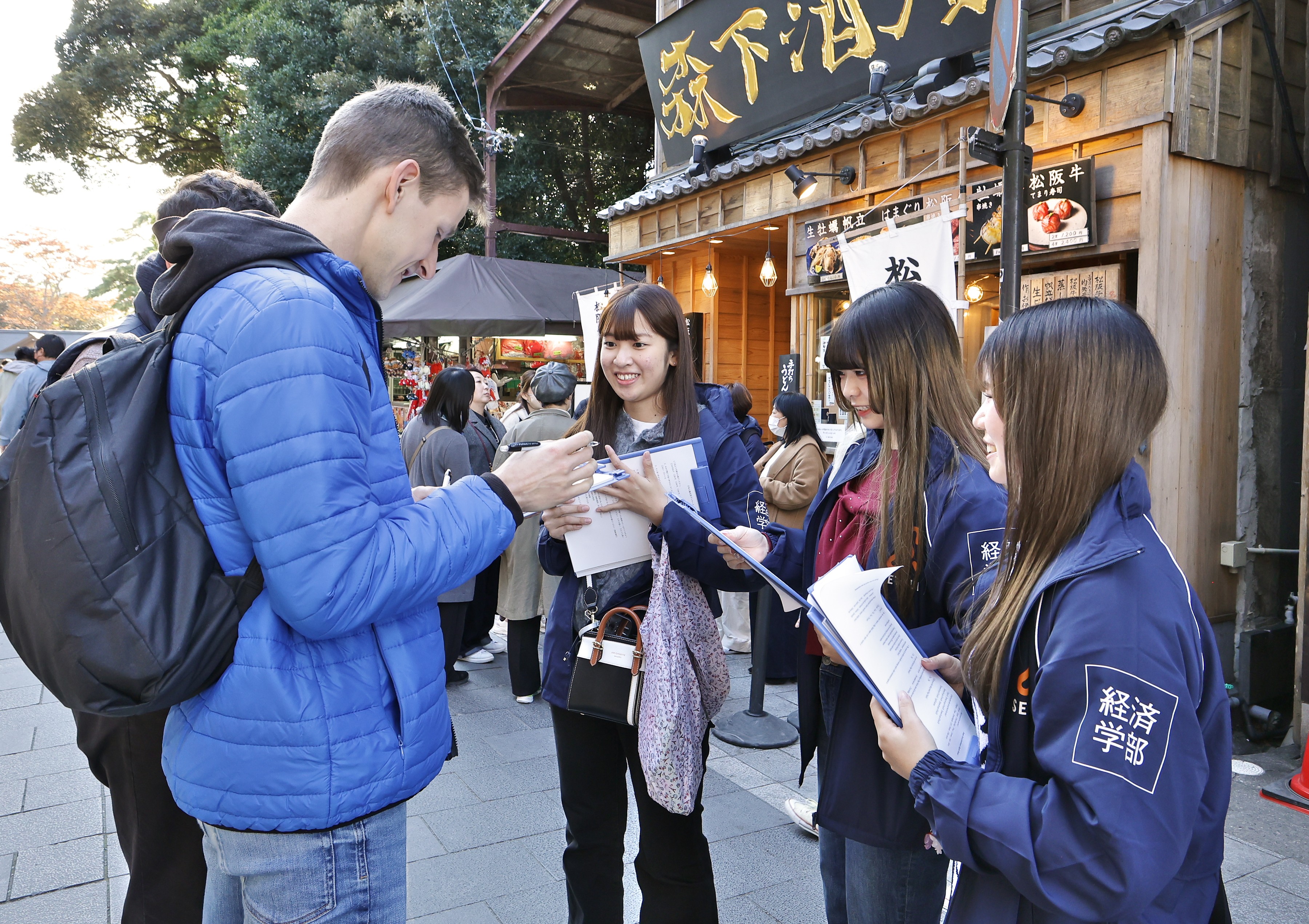 そこで、この課題に対して、名方ゼミでは3つのグループに分かれて調査を実施しました。 第1グループは、外国人観光客を対象に調査を行いました。内容は、出身地や日本のゴミや環境マナーについての質問、さらに「日本に来て良かった点」についての意見を集めました。 第2グループは、レストランや土産店、食べ歩きの店などを訪れ、外国人観光客向けにどのような工夫がされているかを調査しました。 第3グループは、伊勢の歴史と観光客数、そして地域の経済(県内総生産)との関係性について調査しました。