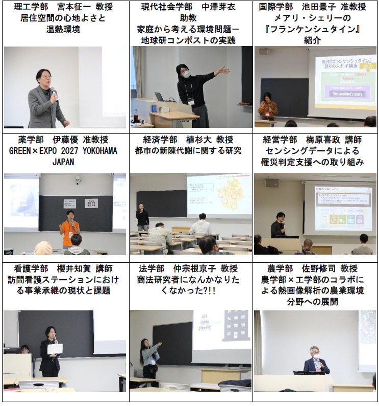 今回の定例会では、摂南大学の全9学部から教職員・学生が参加し、それぞれの専門分野を活かした多彩な研究発表を行いました。理工学系から人文社会系まで、幅広い学問領域にわたる取り組みが紹介されました。