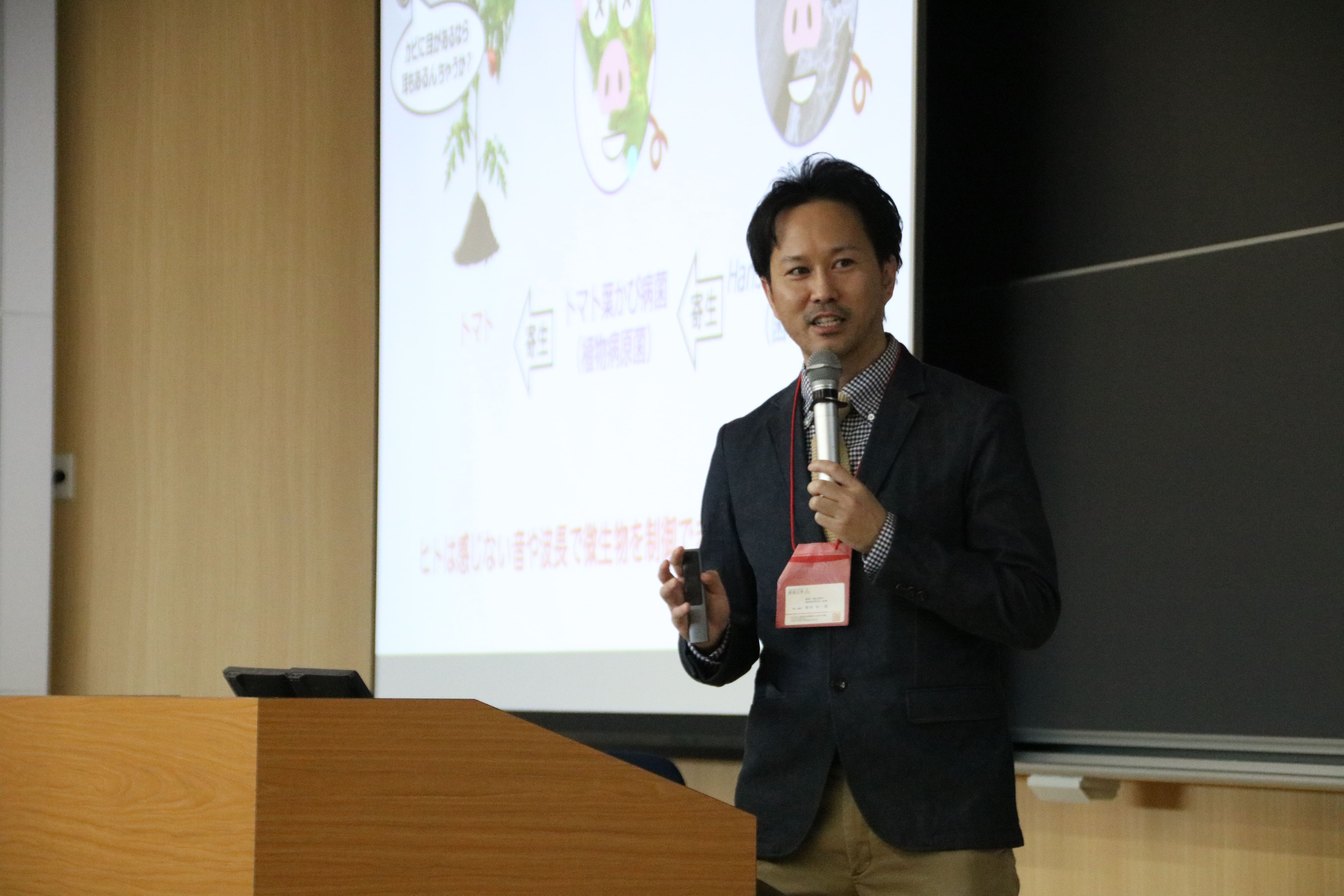 植物病理学の視点から、世界の食料の10~15%が植物の病気によって失われている現状と、80%が「カビ」による病気であることからその解決策について解説しました。化学農薬に代わる持続可能な防除法として、病原菌を食べる「菌寄生菌」や、植物の免疫を活性化させる微生物の研究を紹介。更に、カビが赤色の光に反応して活動リズムを変える特性を利用して強力な寄生菌を作る研究や、音(振動)への反応の有無を探る最新の研究アプローチについても触れました。良いカビの力を引き出し、商品化や食料問題解決に貢献したいと展望を語りました。