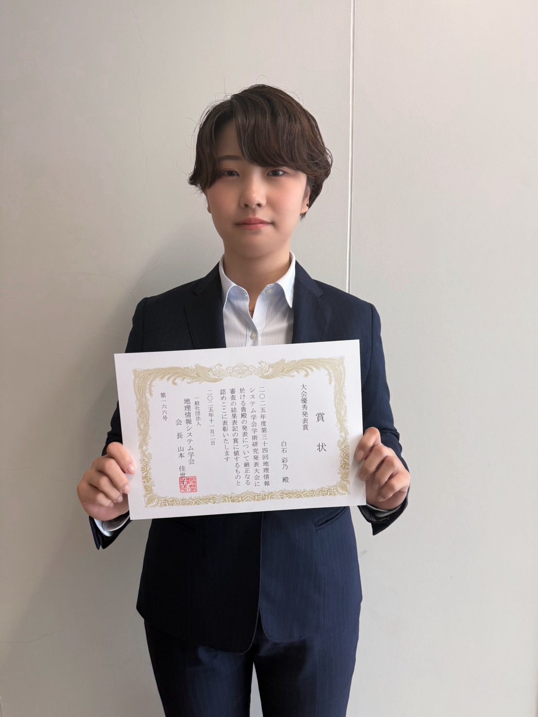 本学大学院理工学研究科社会開発工学専攻 博士前期課程2年の白石彩乃さん(指導教員:都市環境工学科 熊谷樹一郎教授、地域環境計画研究室)が、富山大学五福キャンパスで2025年11月1日〜11月2日に開催された第34回地理情報システム学会学術研究発表大会において、以下の発表内容で大会優秀発表賞を受賞しました。