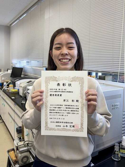 令和7年12月11日に島根県松江市で開催された第121回日本土壌肥料学会関西支部講演会において、岸江さんは「窒素施肥条件に対するイネ種子遊離アミノ酸蓄積応答の品種間差解析」というテーマで口頭発表をおこない、発表内容と質疑応答の様子が高く評価されたことから優秀発表賞を受賞しました。