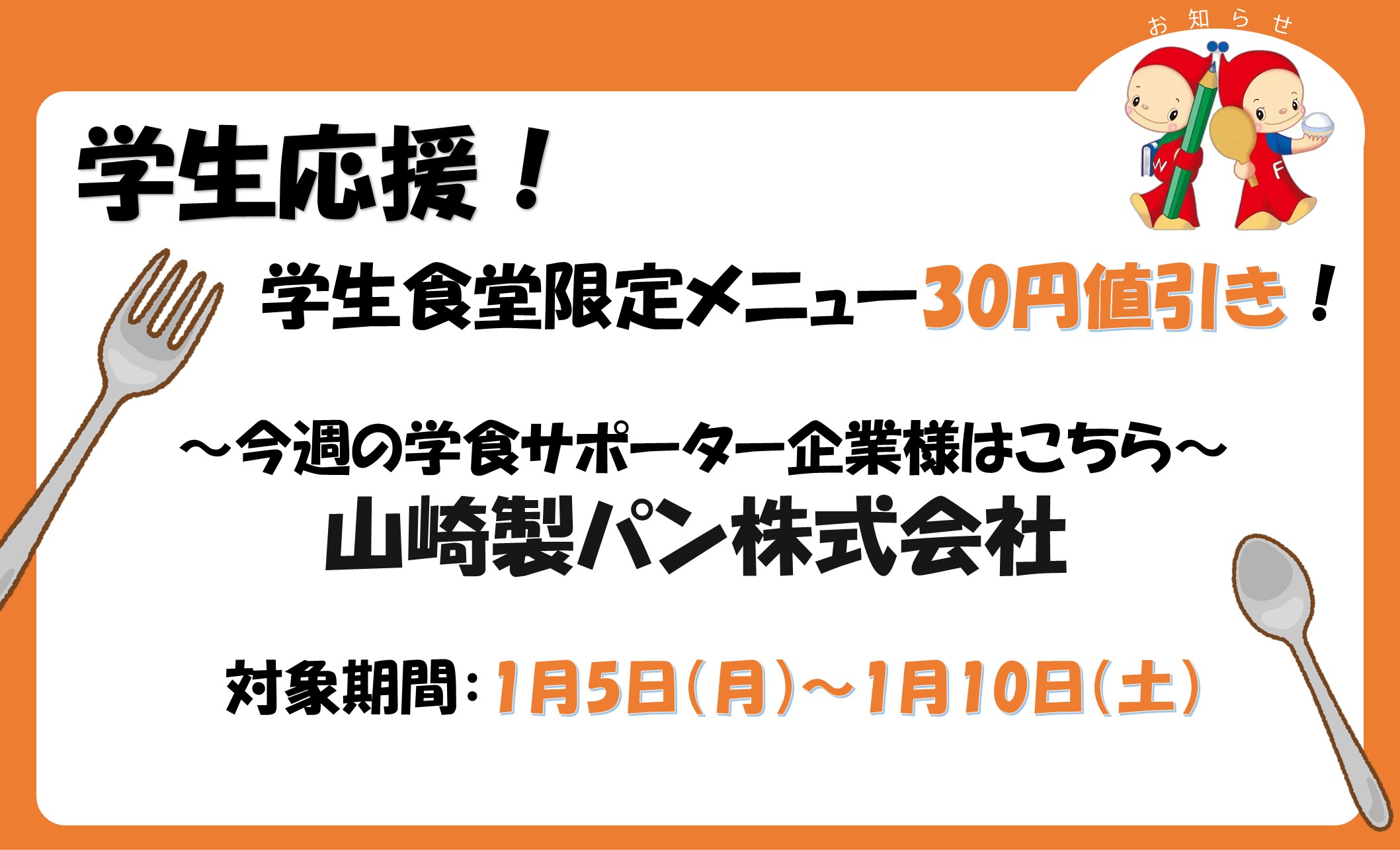 1月5日(月)から1月10日(土)まで、寝屋川キャンパス「せっちゃん食堂」と「レストラン ブォナージョ」、枚方キャンパス「枚方食堂」で、以下の企業様から協賛いただき、学生限定でメニューの値引きを行う食支援を実施します。