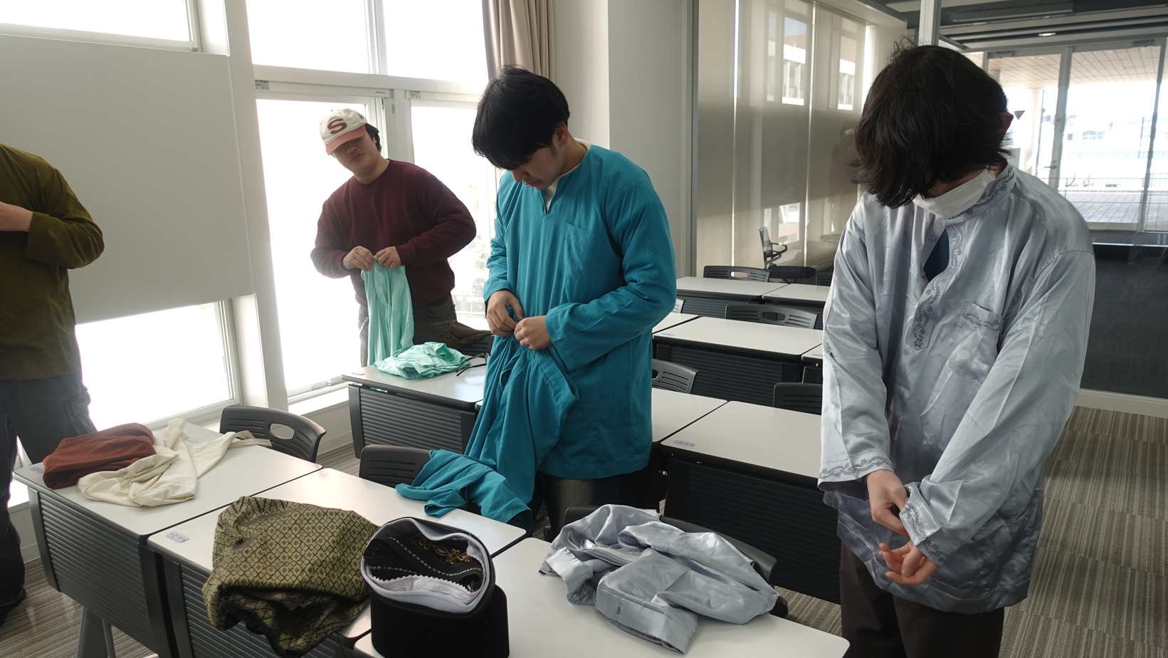 「総合マレー語」はマレー語の基礎的な運用能力を修得する授業です。普段の授業では、配付資料や動画資料などを用いて、マレー語の表現方法についての理解を深めています。12月18日の授業では、前週に学んだことを簡単に復習した後で、マレー人の民族衣装を着用しながら、マレー語の挨拶を学びました。
