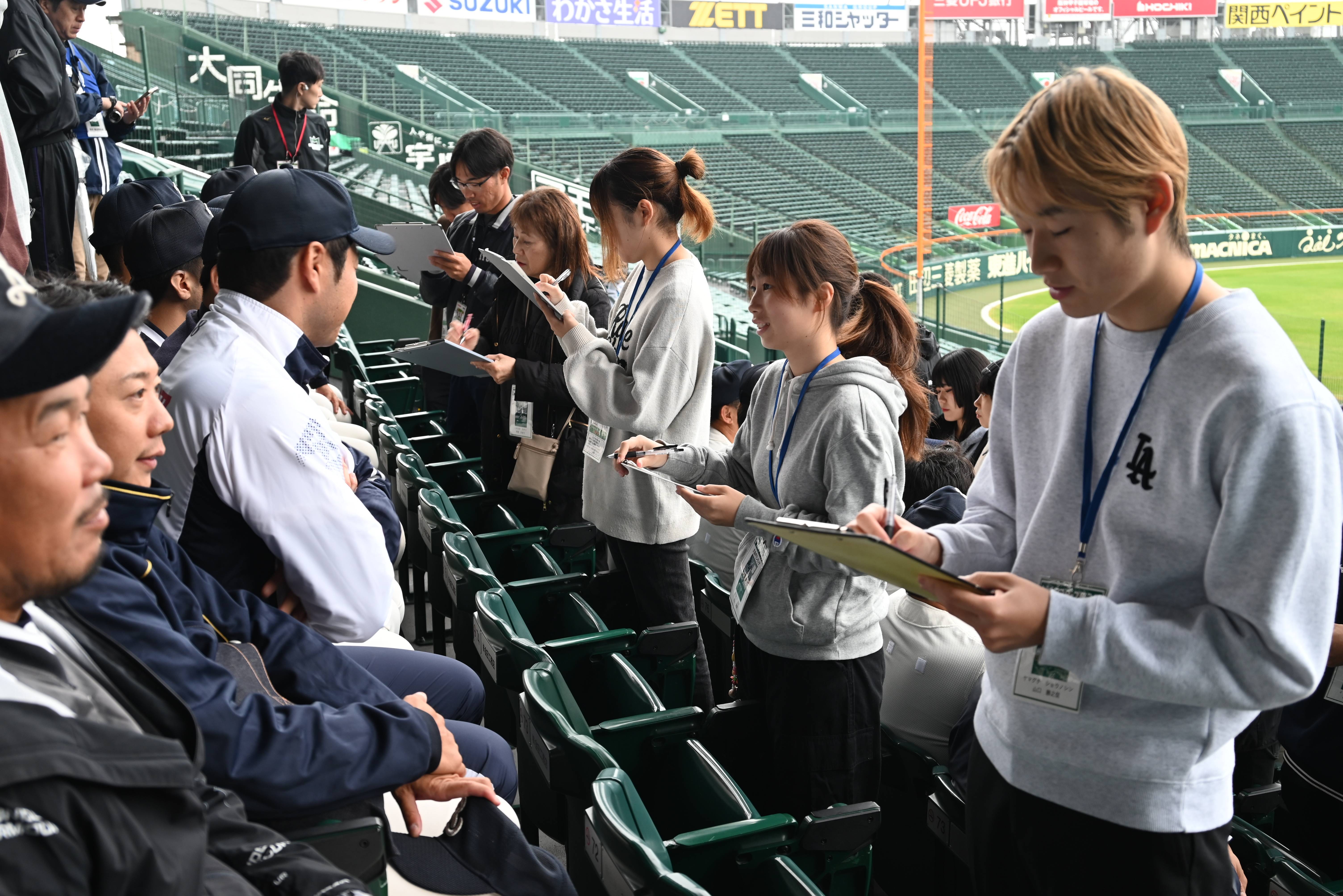 インタビューの他には式典運営や選手の誘導、甲子園キャッチボールのイベント受付、試合配信、写真撮影など、様々な役割を担当しました。