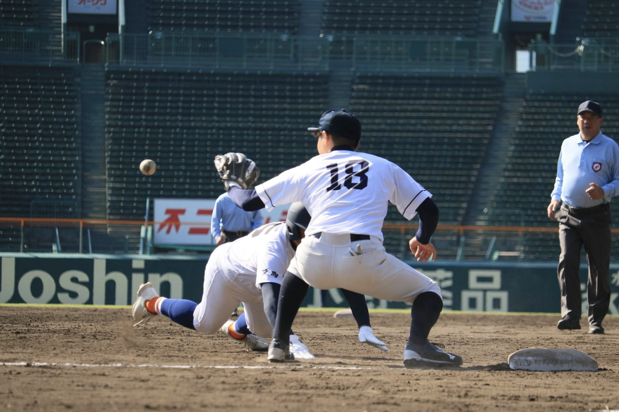 ヘッドスライディングで塁を狙う走者と、ボールを捕球する野手