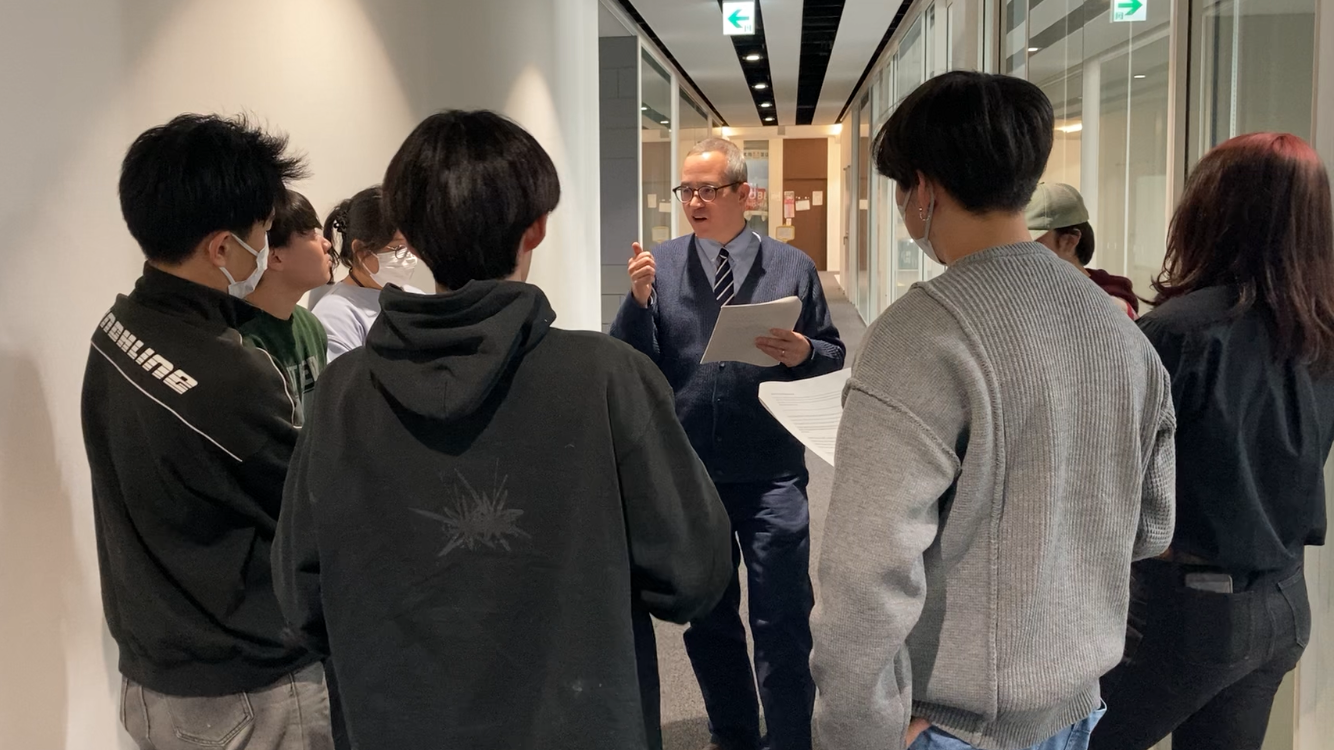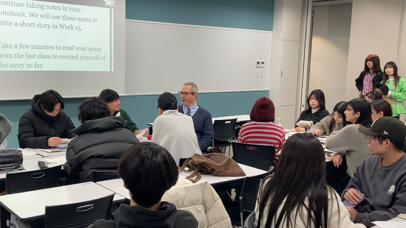 第14回目(1月7日)の授業では、学生が5~6人のグループに分かれ、テーブルトップロールプレイングゲームをしました。テーブルトップロールプレイングとは、プレイヤーが協力して物語を共同で創作するタイプのゲームです。ゲームプレイ中、学生は自身のキャラクターの視点からメモを取るよう求められました。学生は次回の授業で、これらのメモを元にキャラクターの視点に基づいた創作文章を書く予定です。