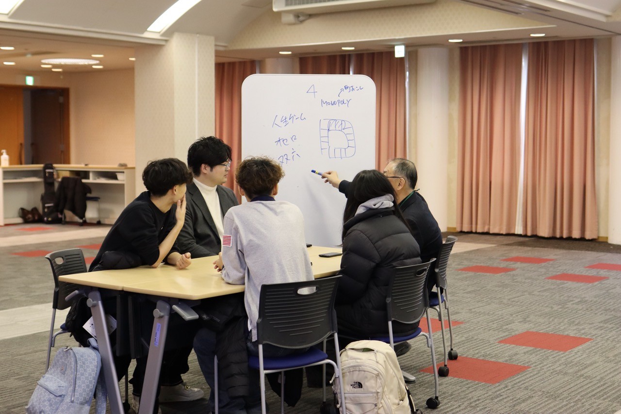 当日は、「新しいボードゲームを作ろう」というテーマで、先生と学生を合わせて4人程度の班を作り、ディスカッションを行いました。この活動では、『RPG発想法』という、自身がさまざまなキャラクターの立場になって、アイデアを出し合う考え方を使用しました。最初は、どんどんアイデアを出す特性を持つ「遊び人」になりきって話し合いました。最後は、アイデアをまとめる特性を持つ「料理人」になりきり、ゲームを完成させました。和気あいあいとした空間で、全員が発言の機会を得ることができました。各班の発表の際には、「実際に遊びたい」や「面白そうだけどルールが難しいかも」などの反応もあり、盛り上がりました。