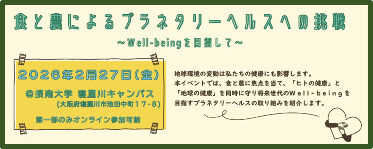 摂南大学(学長:久保 康之)は、2月27日、寝屋川キャンパスにおいて「開学50周年記念 第1回摂南大学市民大学講座」を開催します。テーマは「食と農によるプラネタリーヘルスへの挑戦 ~Well-beingを目指して~」です。