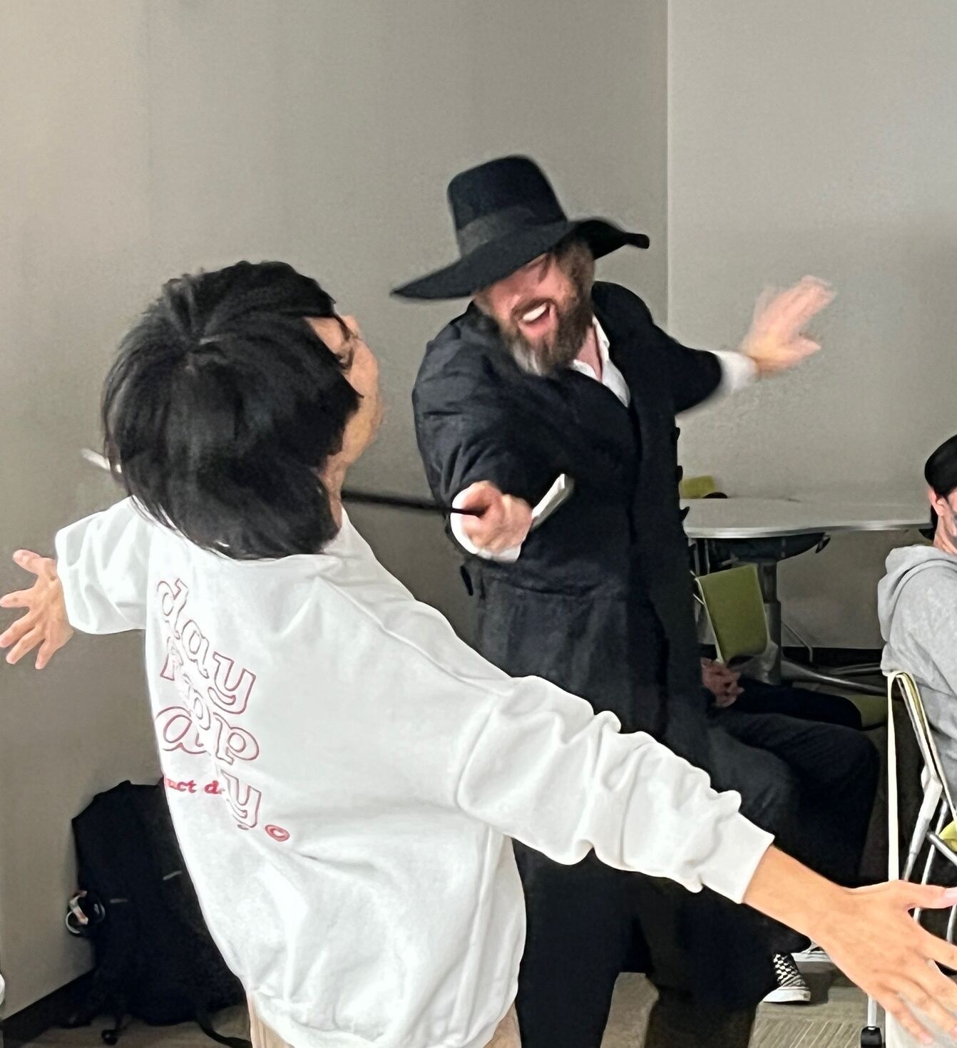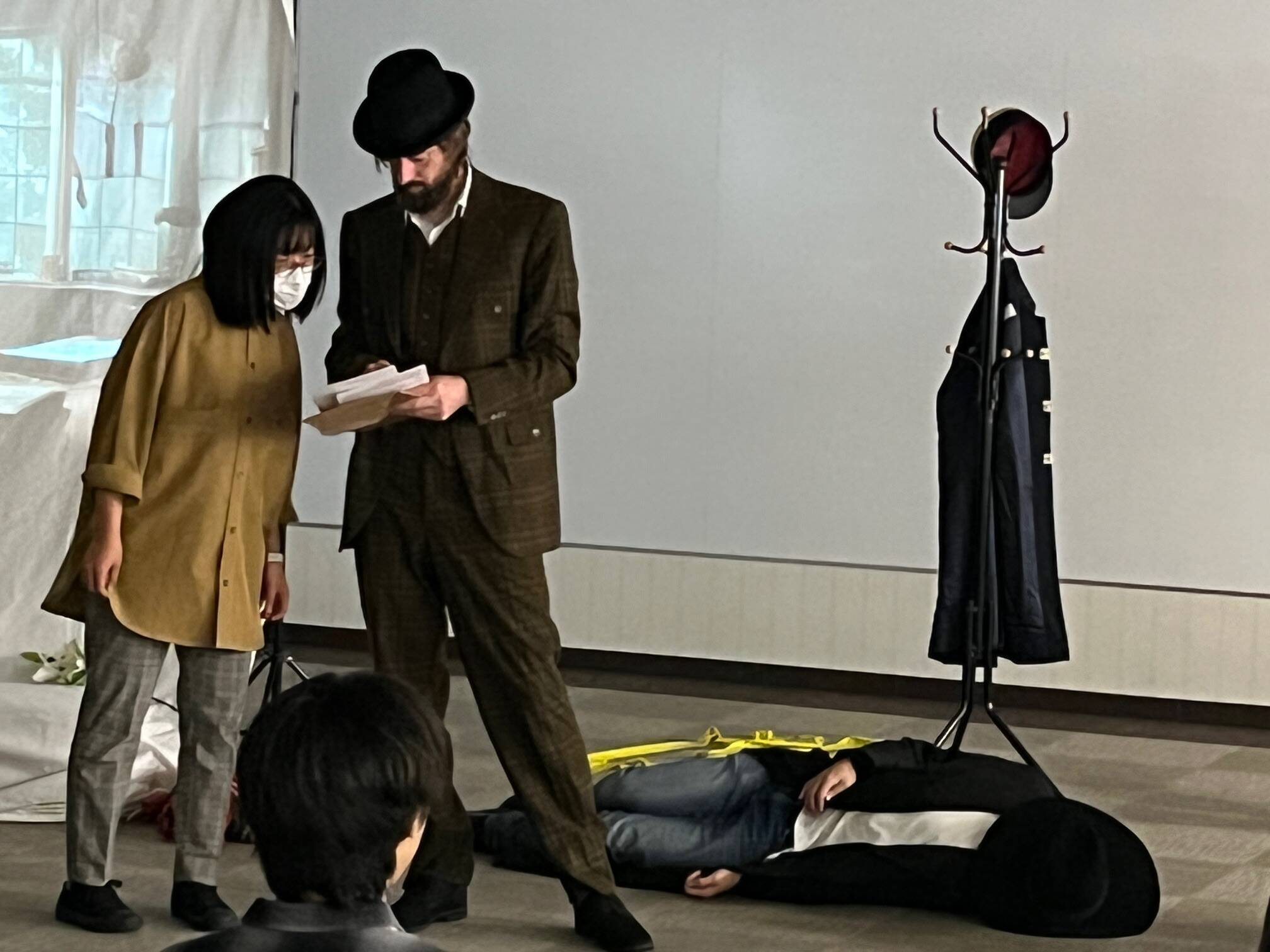 70名あまりの学生が集まり、予想していない瞬間に多数の学生が芝居の中に身を置く体験をしました。アレッサンドロ先生は一人で何役も演じながら、客席から相手役を次々に選んでいきます。学生は衣装や小道具をその場で渡され、英語で次々にセリフや動きを演出され、場面が展開します。たとえ発音がよくても演技のタイミングがいまひとつだったり、話すセリフの内容と話し方や動きが合っていなかったりすると容赦なく"Try again.” 言語は文法的な正しさだけでは伝わらない、音声と身体表現が適切に伴ったときにもっとも有効に聞き手に(芝居では観客にも)伝わる、ということを学ぶ時間になりました。 写真は素晴らしい仕上がりになった場面の抜粋です。