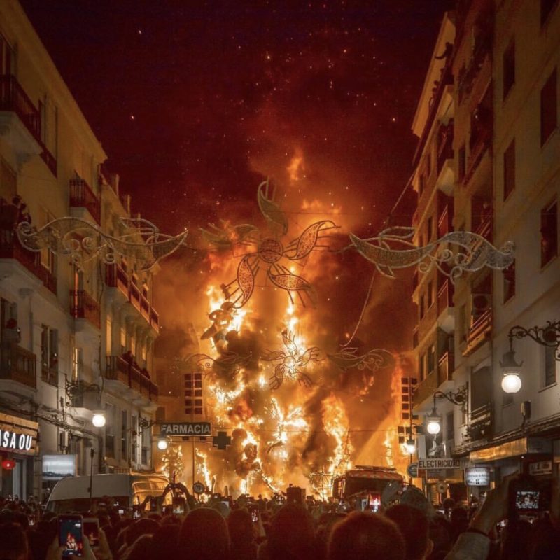 今回、私はスペイン三大祭りの1つであり、世界遺産にも登録されているLas Fallas (ラス・ファリャス/バレンシアの火祭り)についてお話しします。火祭りの期間中には様々なイベントがありますが、一番の見どころは “Fallas” と呼ばれる火祭り人形です。ビル4階ほどの高さに相当する巨大なものから小さなものまで何百体といった人形がバレンシア市内に並べられます。人形はその年に話題になった有名人や出来事などの時事問題をモチーフにしており、人気投票で1位に選ばれた人形は博物館に展示され、それ以外の人形は3月19日の夜から20日にかけて順番に全て燃やされてしまいます。メインである市庁舎広場の巨大な人形を燃やすところを見物しましたが、人形から数十メートル離れた場所にいたにもかかわらず、炎の熱気が全身にまで伝わり、巨大な炎が観ている人たち全てを魅了しているんだなと肌で感じました。