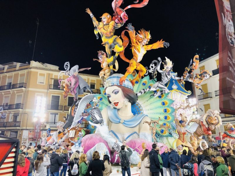 また、3月1日から19日までの毎日14時に爆竹のショーが市庁舎広場をはじめ街の至る所で開催され、大人も子供も関係なく爆竹を鳴らして楽しみ、大きな音と煙が印象的でした。夜には色付きの煙が出る爆竹が使用され、ライトアップされた人形や無数のライトで装飾されたイルミネーションで街が飾り付けられます。さらに、火祭りの期間中はスペインの伝統衣装の中でも特に豪華であるとされているバレンシアの民族衣装を着飾った女性も目にすることができて、豪快さだけでなく伝統的で繊細な面も感じられたお祭りでした。