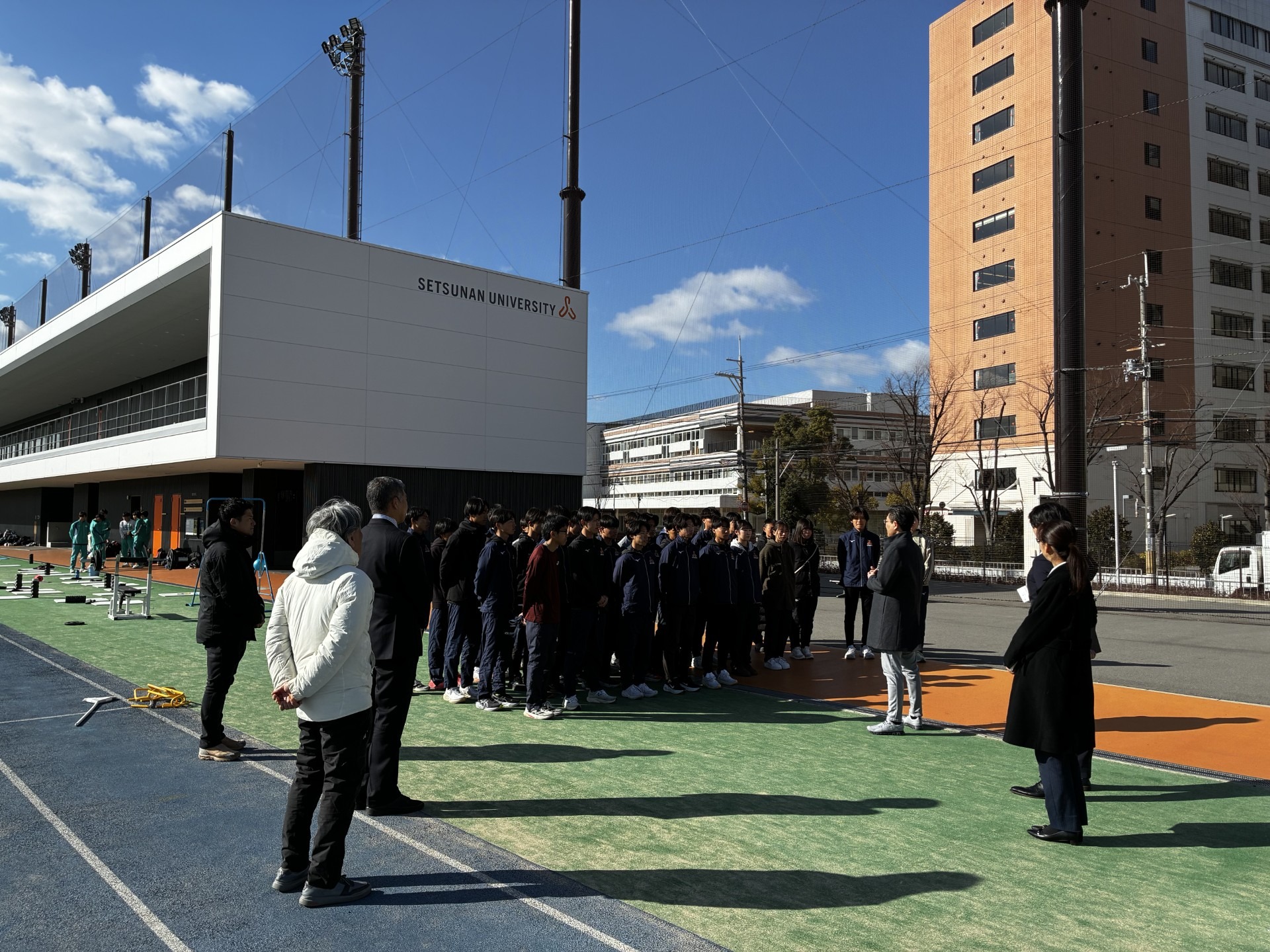 「アスリートは、心と身体が資本。この素晴らしい施設環境のもと、心は実績ある指導者の方々と育成し、身体は皆さんの強い信念をもって強く作り上げていってください。長きにわたって寝屋川で頑張る地元同士、互いに頑張りましょう。微力ながら、引き続き応援しています」と代表取締役からのメッセージに対し、両部主将からは「これまでのご支援に大変感謝しています。好成績を残し、それをもって御社への恩返しとなるようこれからも努力を続けます。今後とも応援よろしくお願いします。」と、応えました。