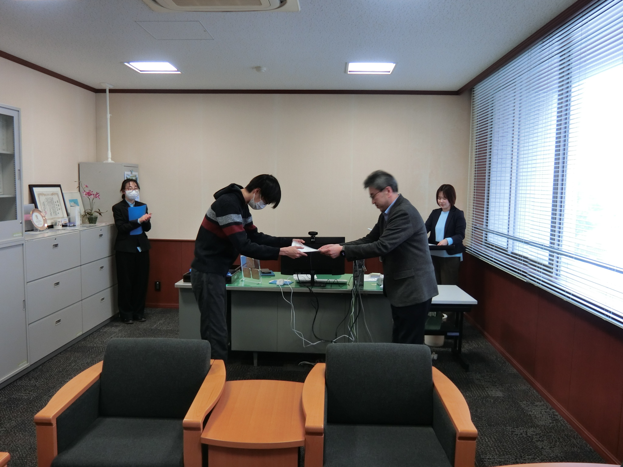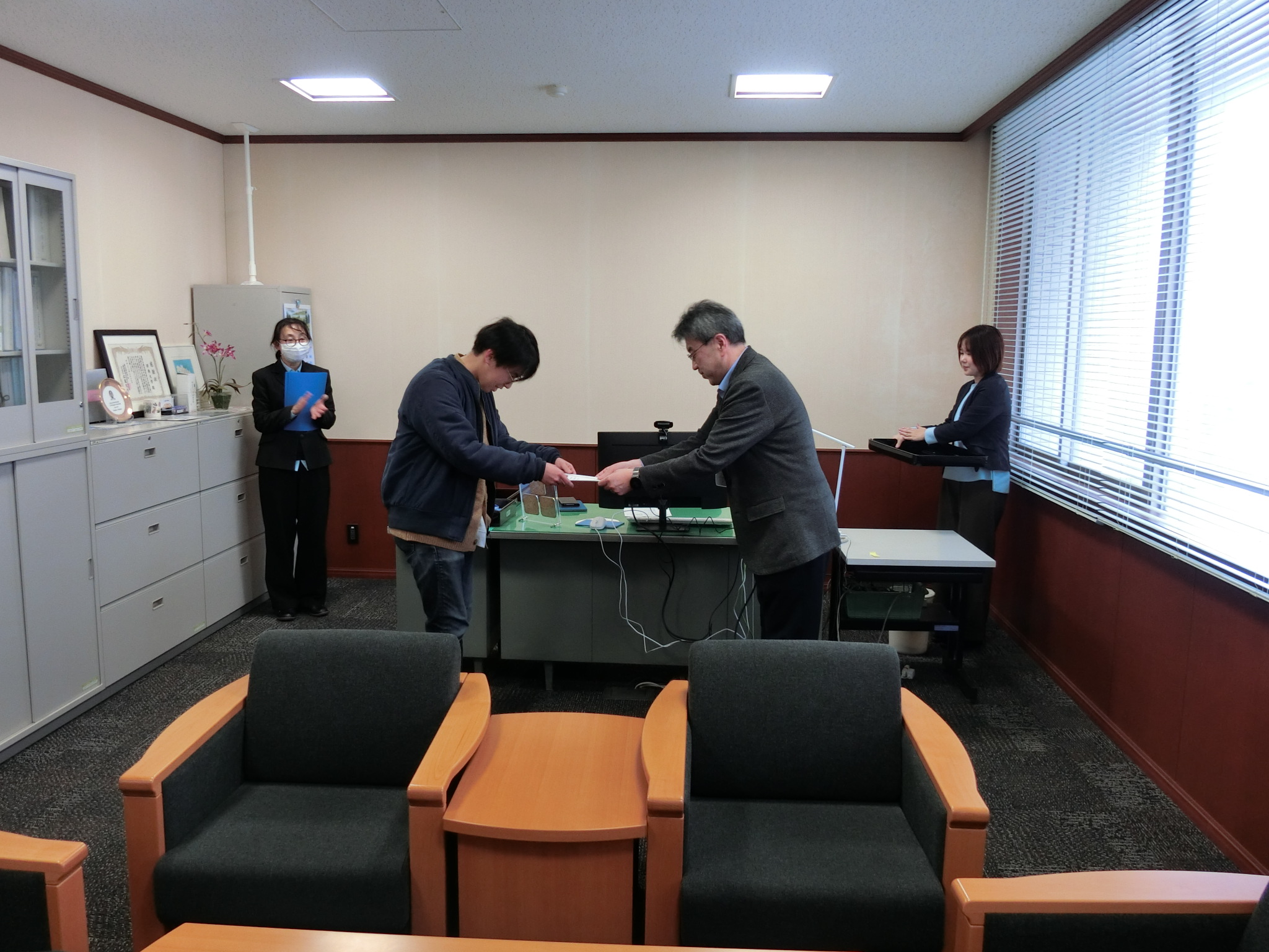 西村理工学部長から学生たちへ激励の言葉が送られ、学生一人ひとりに賞状と副賞が授与されました。