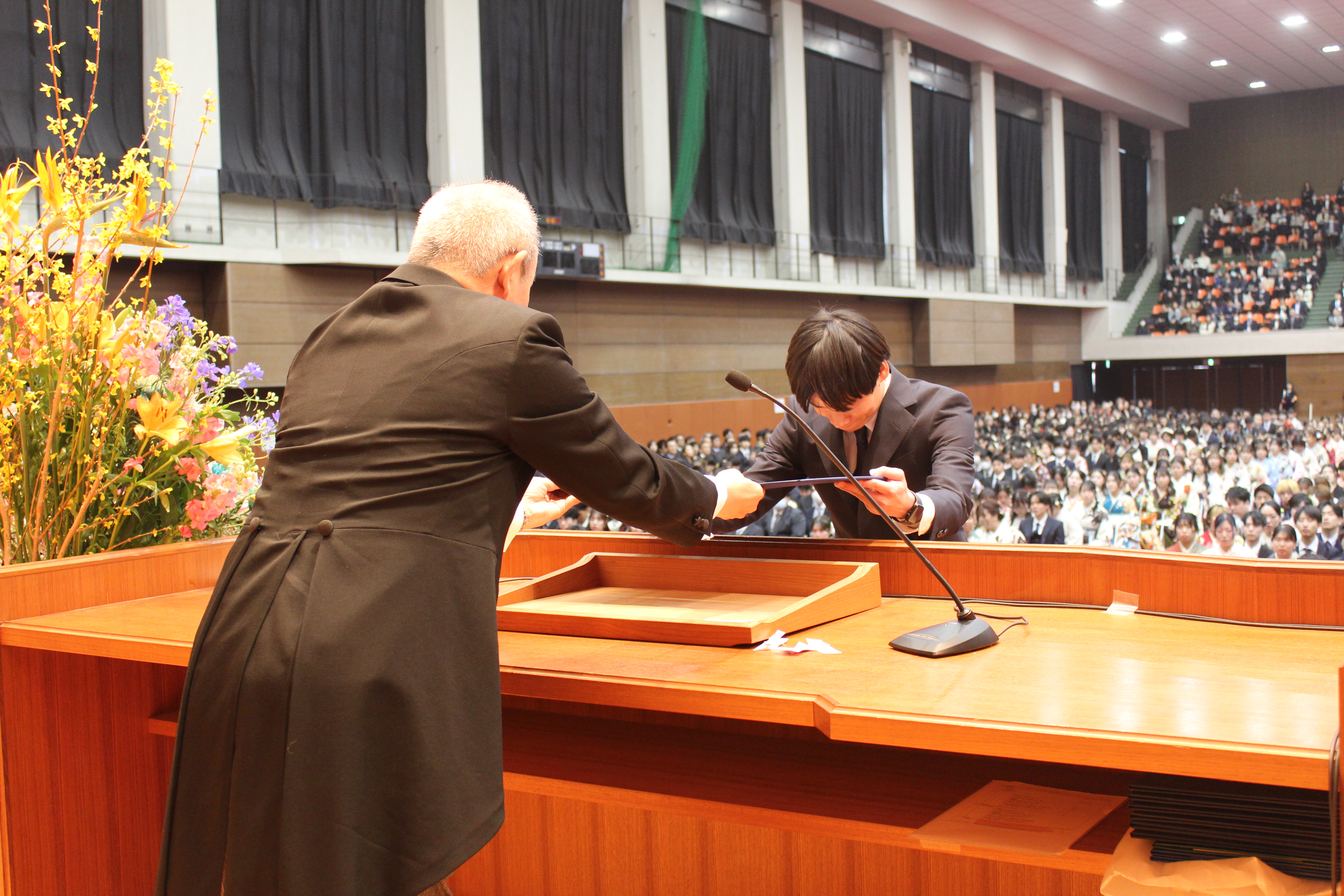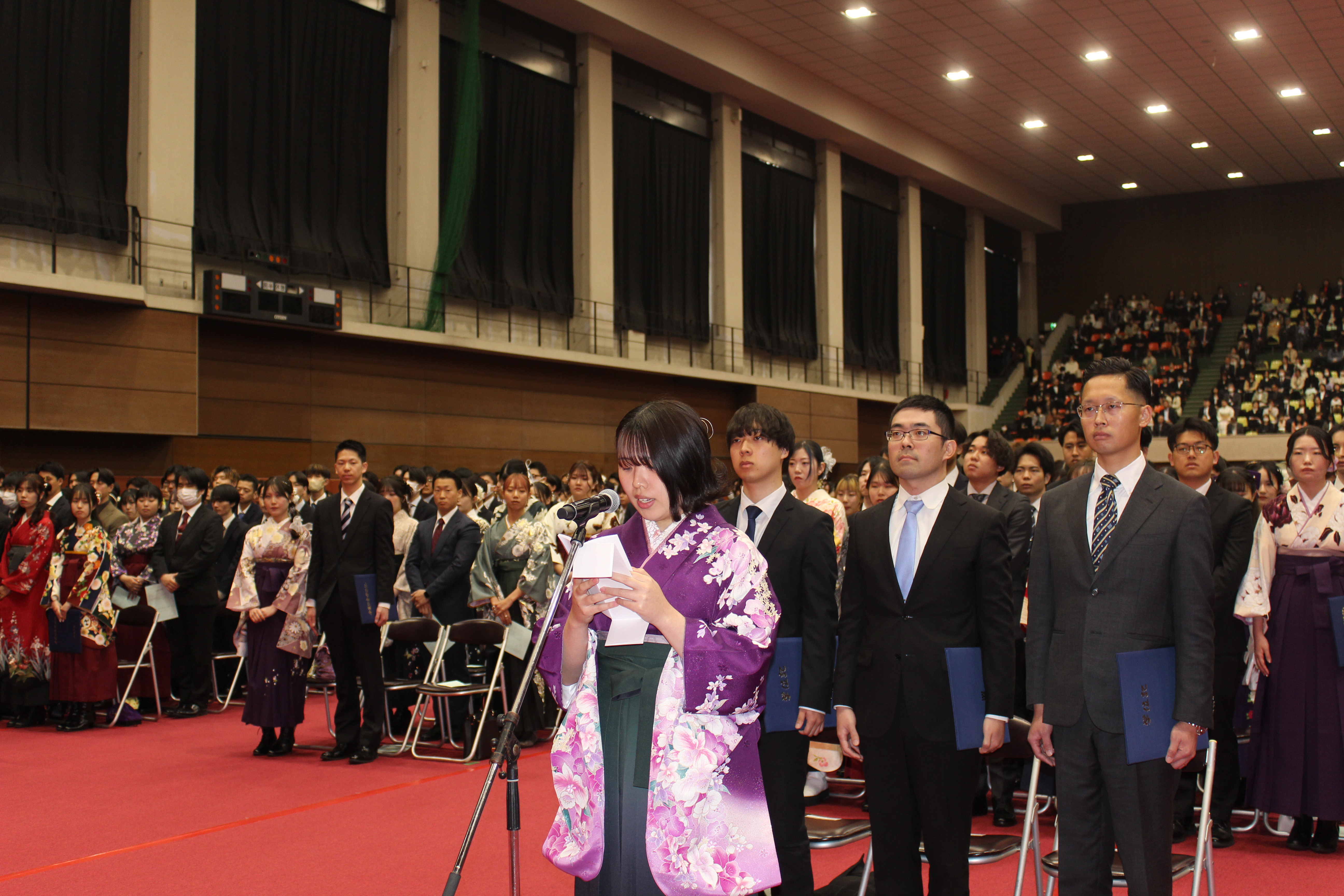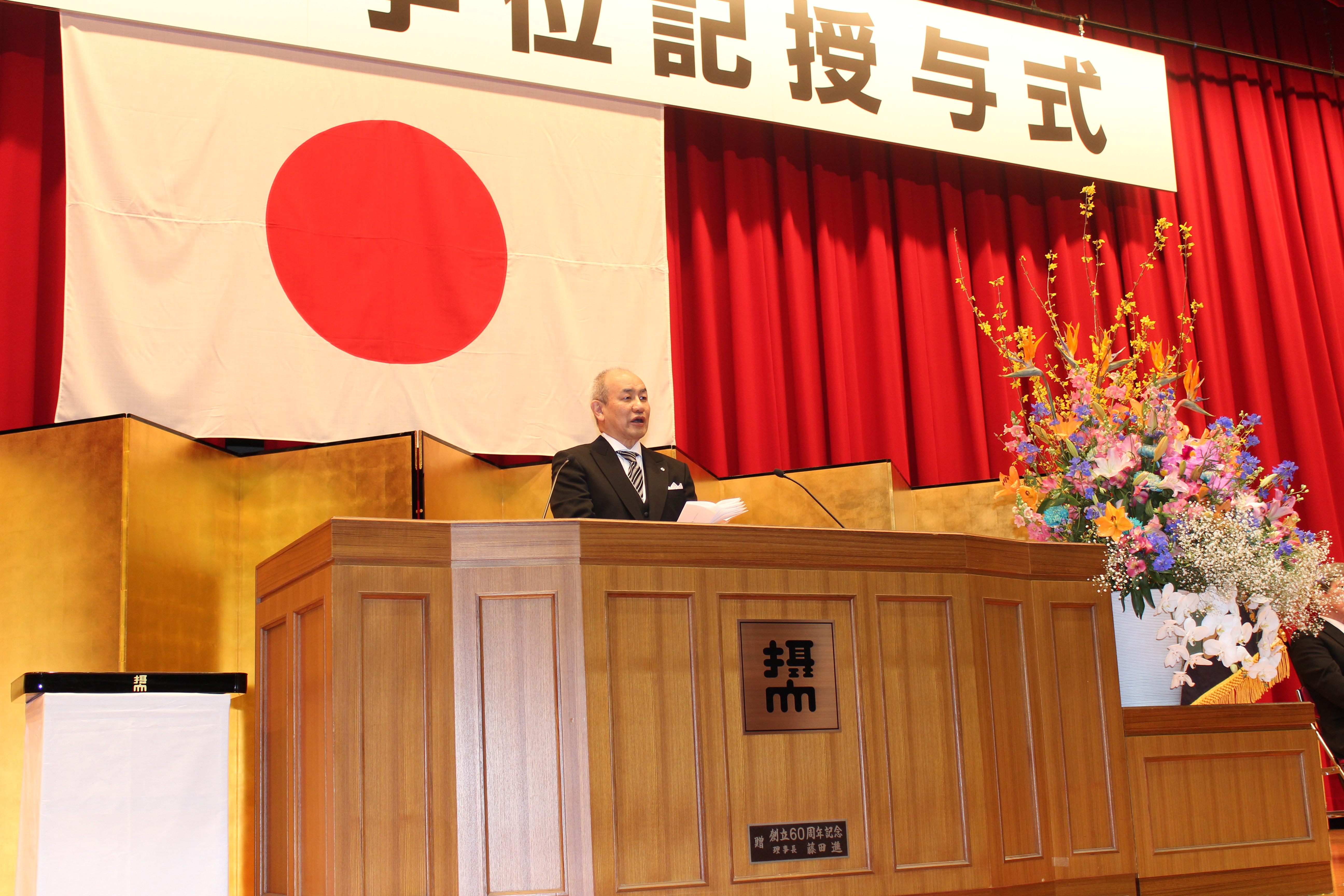 久保康之学長は、式辞の中で「摂南大学の学生の成長力は、どこへ行っても誇れるものです。皆さんがこの大学で培った学びと経験は、これからの人生において必ず大きな力になると確信します。皆さんは摂南大学で学び、多くの仲間と出会い、さまざまな経験を重ねてきました。その時間は、これからの人生において必ず皆さんを支えてくれるでしょう。どうか、自分らしく歩んでください。そして、人を思いやる心を持った人間として、社会の中で大きく羽ばたいてください。(摂南大学開学)50周年という節目の年に巣立つ皆さんが、それぞれの場所で新しい未来を切り拓いていくことを、心から期待しています。」と語りました。