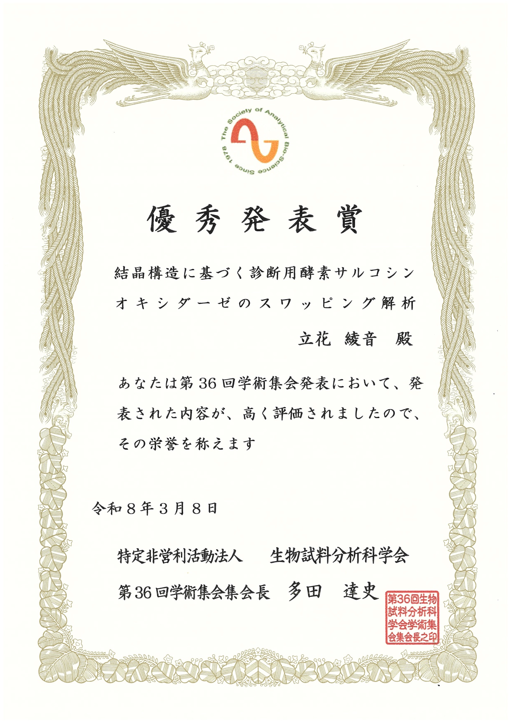 2026年3月7~8日に香川県高松市のサンポートホール高松にて、第36回生物試料分析科学会年次学術集会が開催されました。本学術集会では、臨床検査をはじめとする様々な分析科学に関する講演が行われ、一般講演のセッションにて発表した生命科学科4年の下記学生が優秀発表賞を受賞しました。
