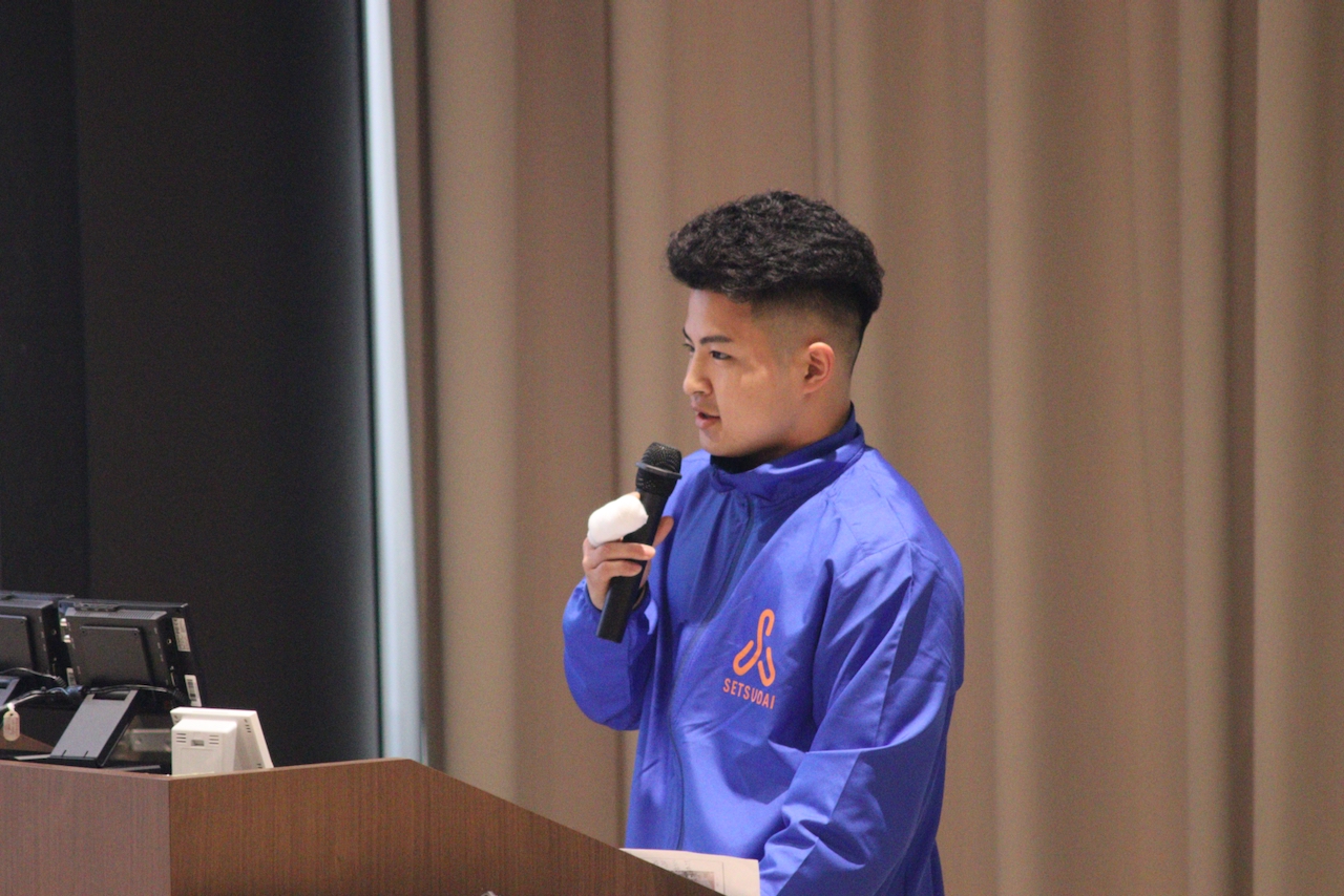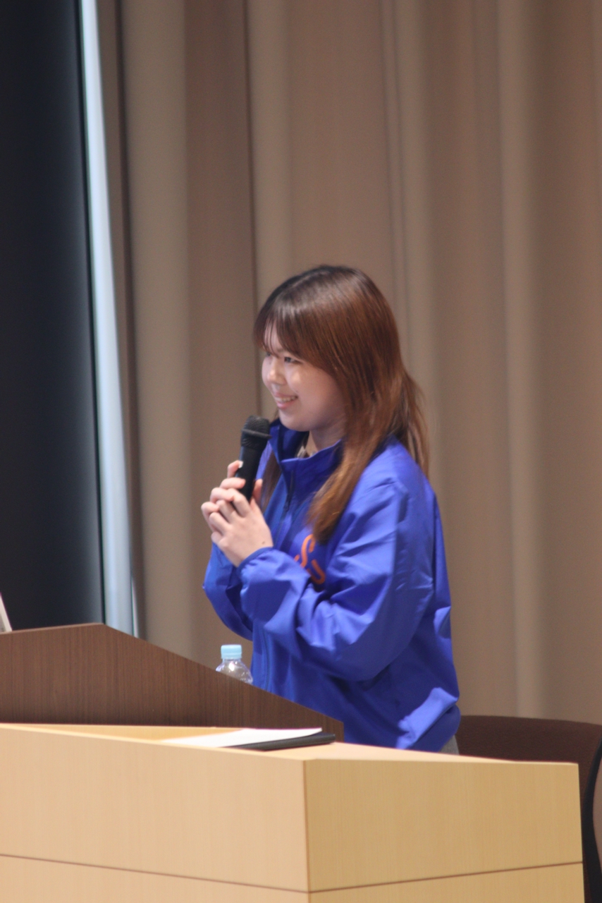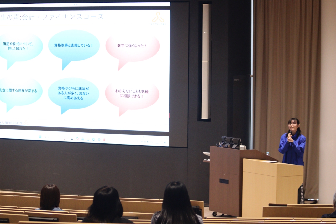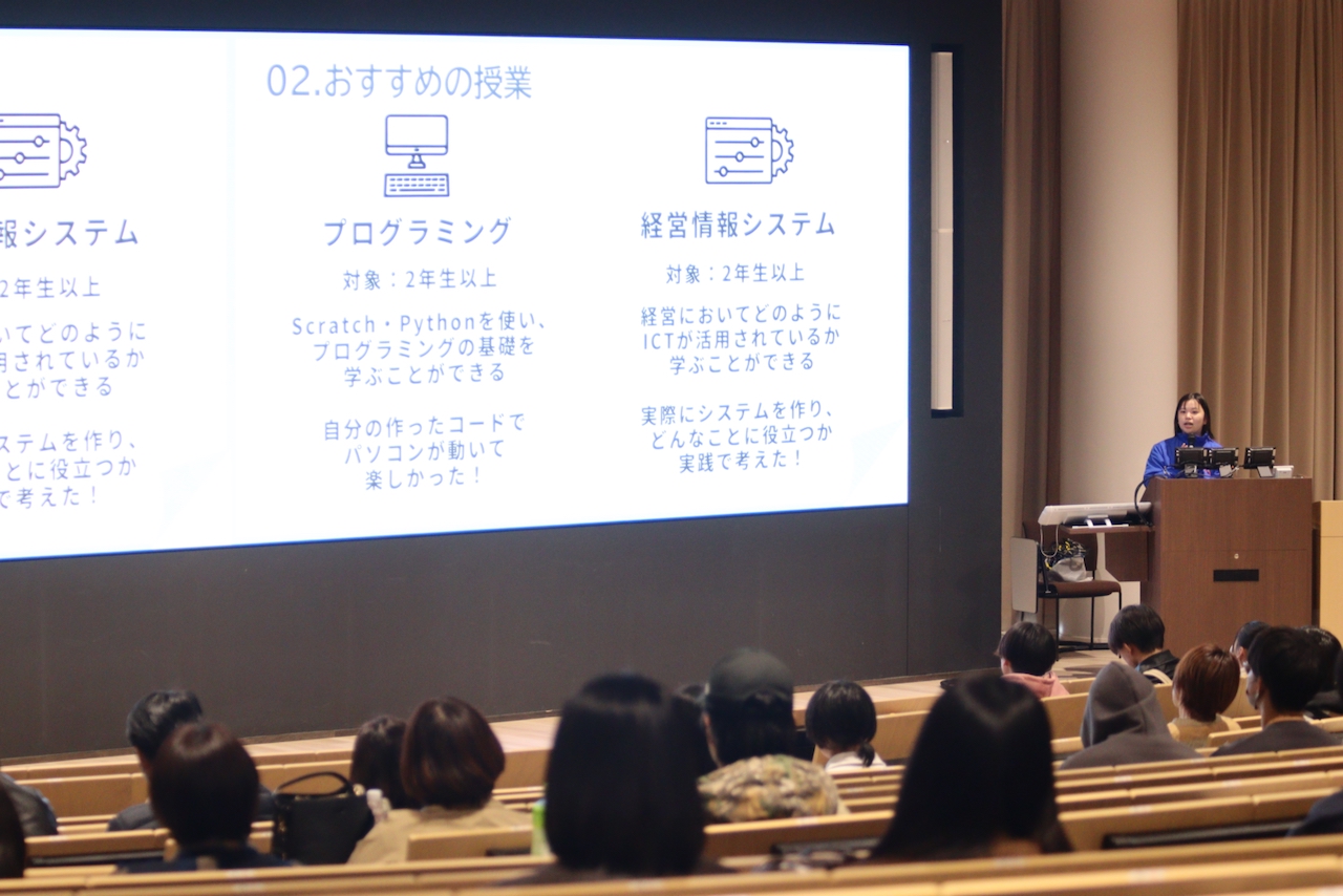 経営学部の学生が「なりたい自分」を探している自分たちの「今」を参加者の高校生、保護者のみなさんに説明しました。